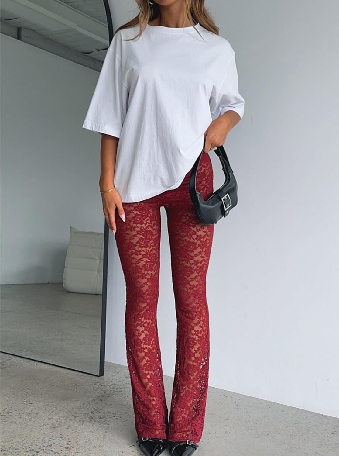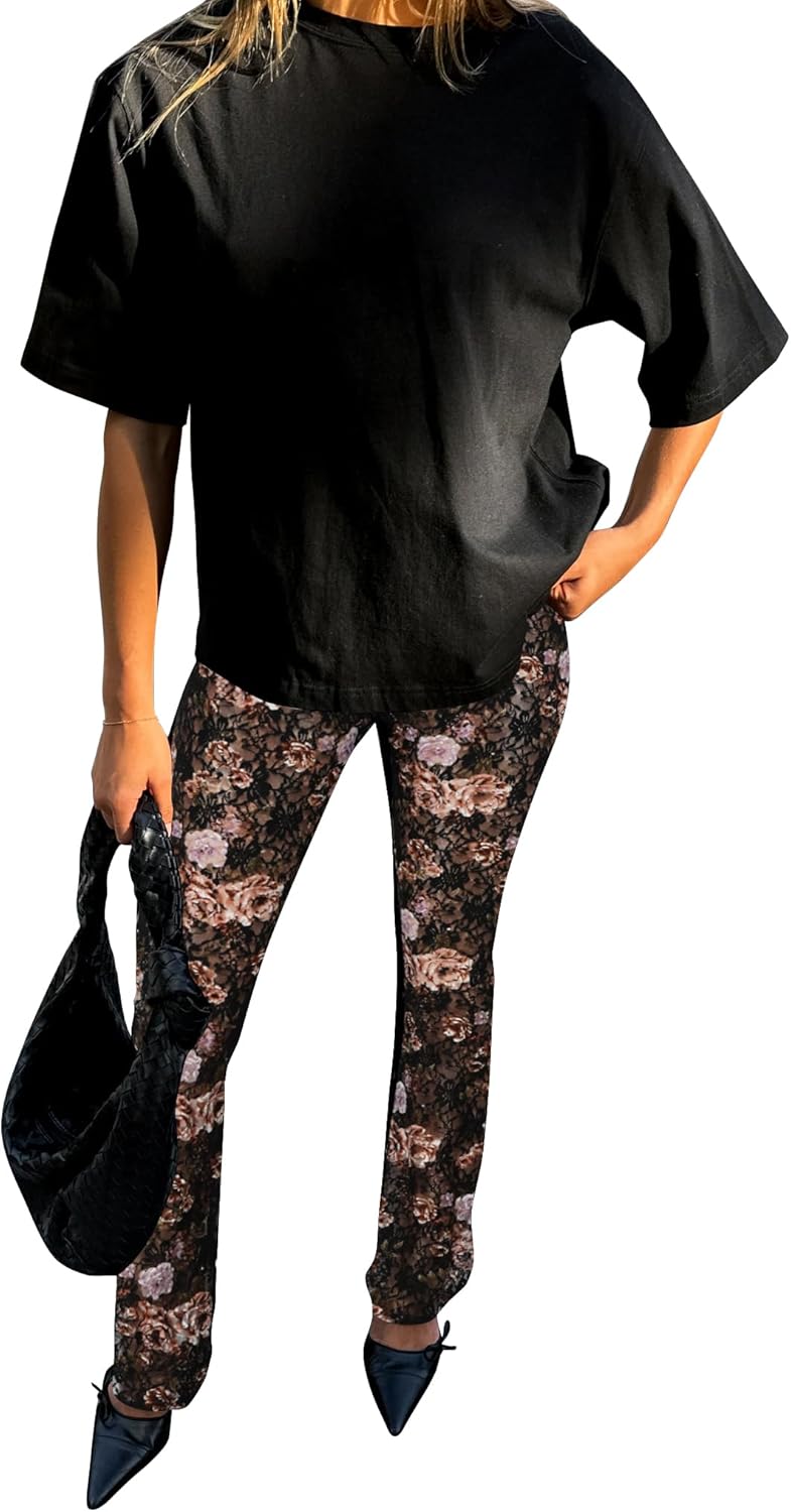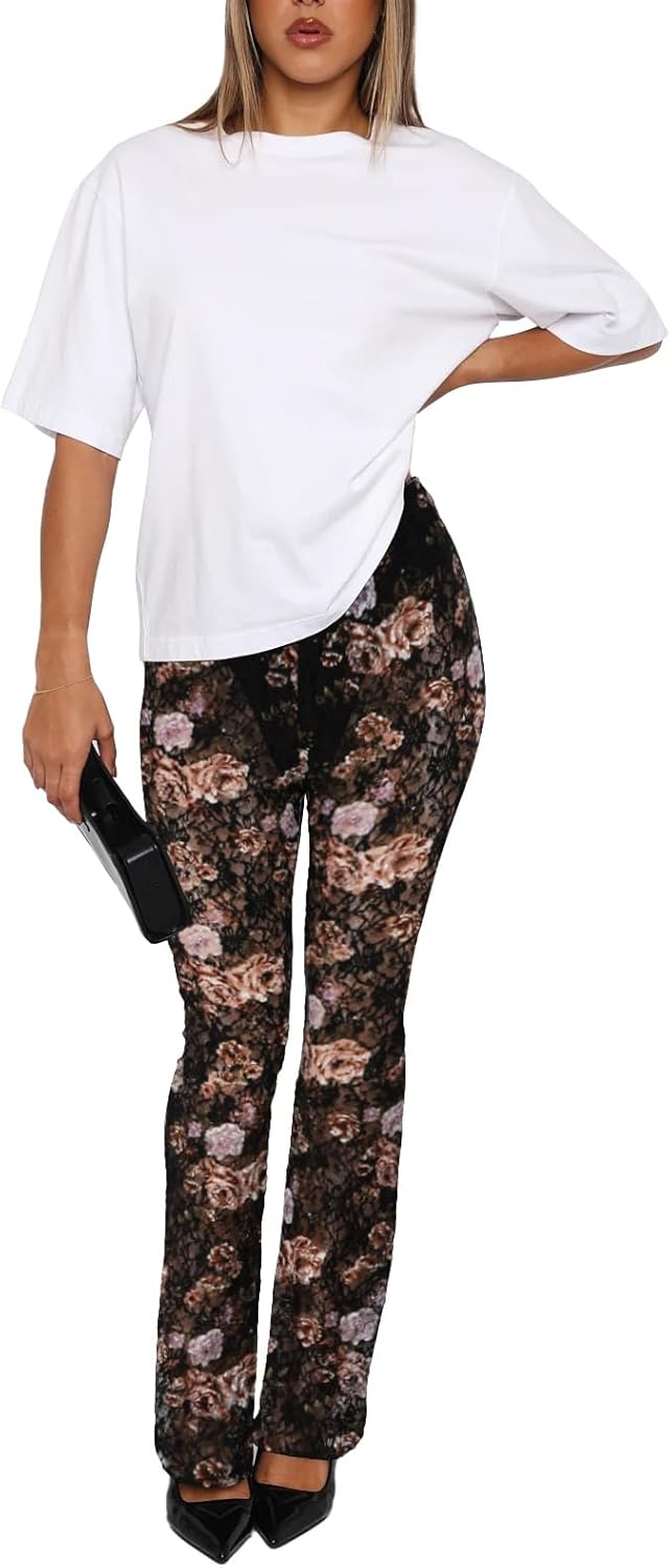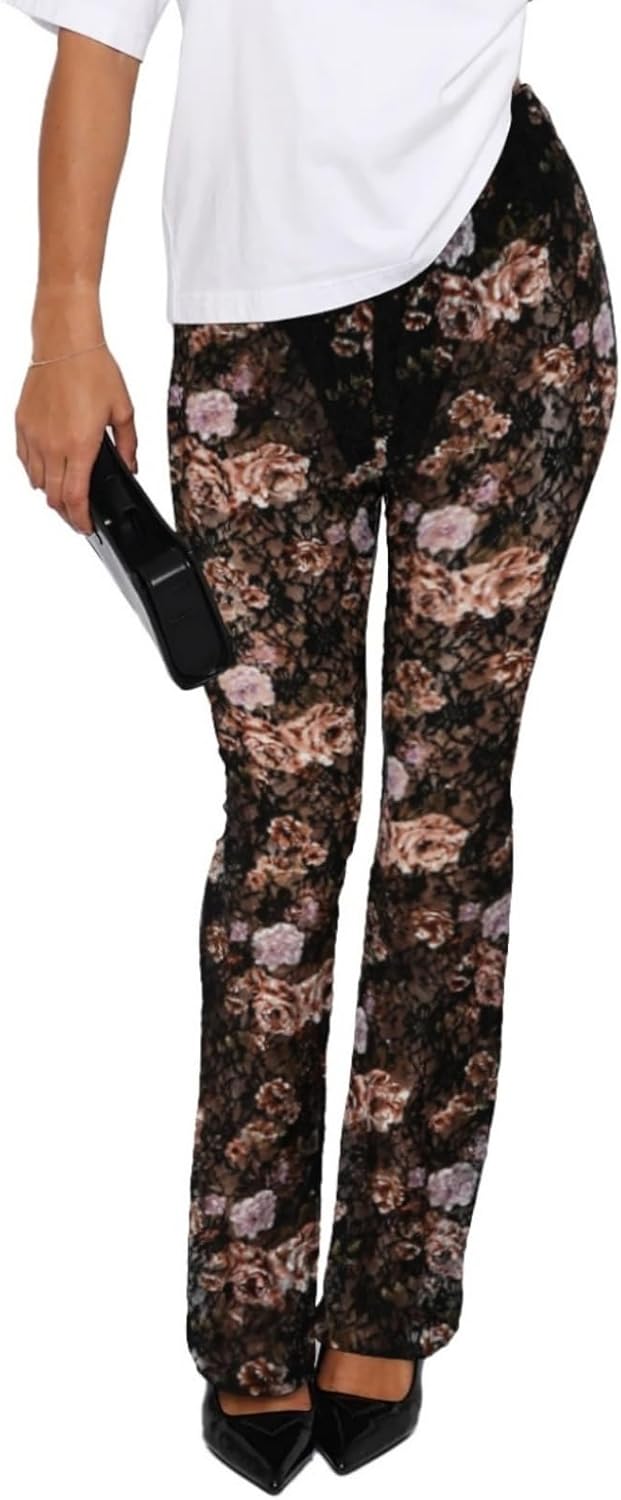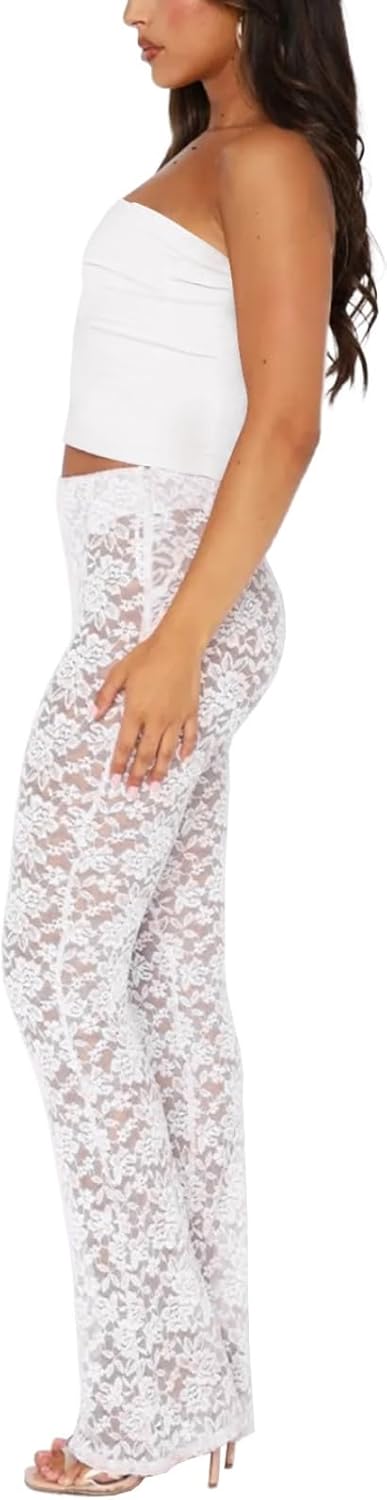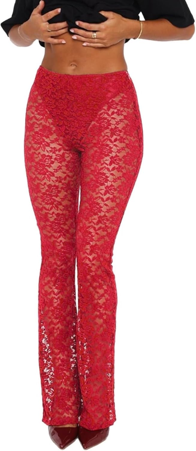 Womens Summer Y2k Sexy Lace Sheer Leggings Flared Leg Pants Stretch Party Club Streetwear 2025