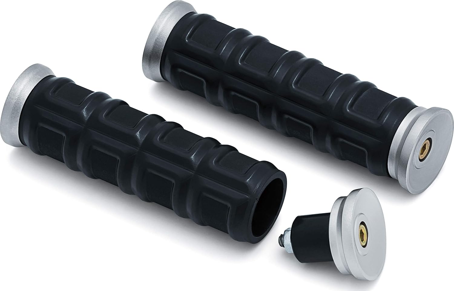 The Kuryakyn 6679 Dillinger handlebar grips combine a narrow profile with ripped EPDM rubber allowing excellent grip control. Gain commanding control and a soft, vibration dampening foundation to combat hand and forearm fatigue. Removable aluminum end caps allow use and installation of bar-end mirrors, turn signals, or weights. Includes (1) satin black, right side 1. 035" inner diameter throttle grip, (1) satin black, left side . 875" inner diameter clutch grip, (2) symmetrical end caps, and (2) tubes of adhesive; suggested for installation (not included): utility knife, sandpaper, electrical tape, and a non-permanent marker. The Kuryakyn 6679 Dillinger handlebar grips are universal fit for 7/8" diameter handlebars with open ends; grip length measures 5" x 1 1/2" diameter.