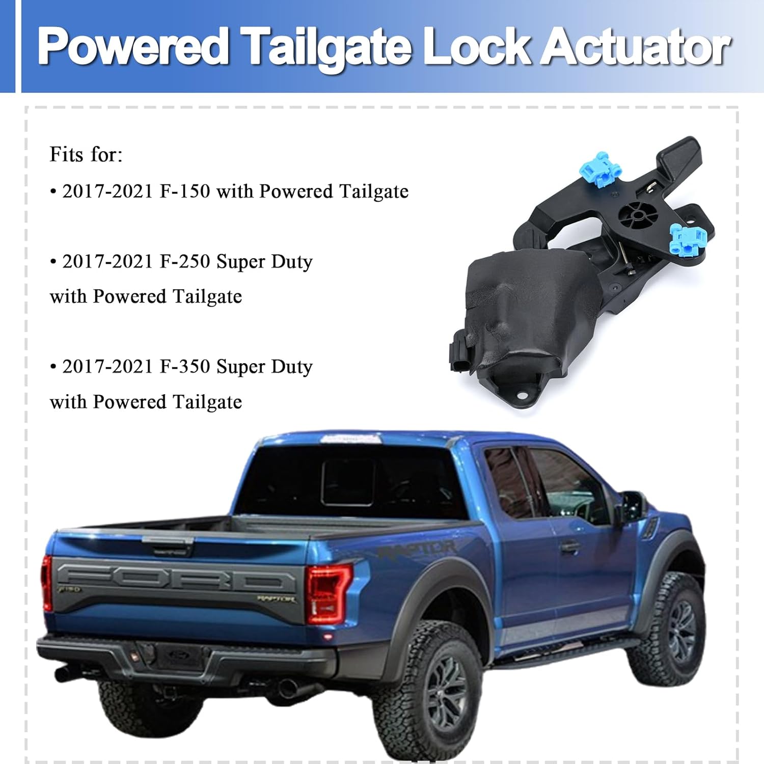 Powered Tailgate Lock Actuator Fits for:Fits for 2017-2021 Ford F150 F250 F350 Super Duty with powered tailgate.Replace Part Number:GC3Z9943170BGC3Z9943170CGC3Z9943170DGC3Z9943170EFL3Z9943170CHow to Install:1. Remove the screws on the bezel and pull out the bezel.2. Remove the screws on the actuator with the bolts.3. Remove the old actuator and pull out the back plug, then install it.Package:The package includes 1 x Rear Gate Powered Tailgate Lock Actuator.