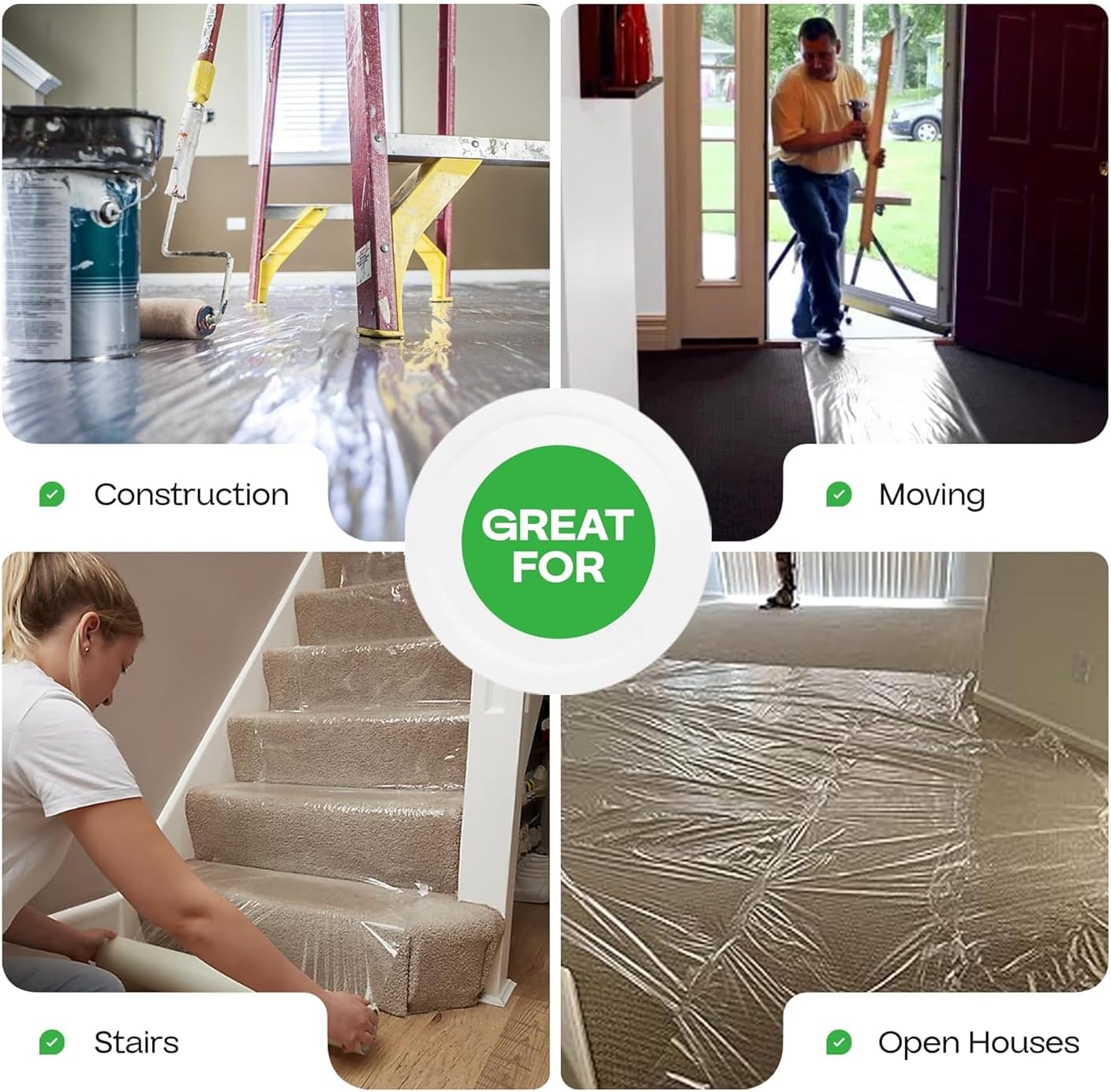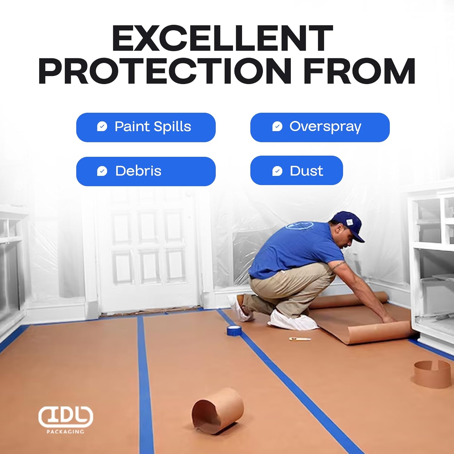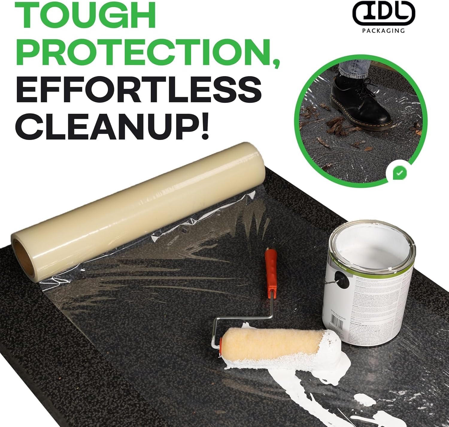 Protect your floors effortlessly with the Carpet Protection Film, a versatile and reliable solution designed for a wide range of uses, including construction, remodeling, and moving. Measuring 24 inches in width, 200 feet in length, and 3 mil in thickness, this professional-grade plastic for carpet protection ensures comprehensive coverage and long-lasting durability. Engineered for superior strength, the tear-resistant and waterproof material provides 45 days of robust protection against dirt, dust, spills, and debris. Its waterproof design effectively shields your floors from water, paint, beverages, and other common spills, making it an essential tool for both residential and commercial projects. Installation is quick and hassle-free, thanks to its reverse-wound roll and user-friendly removable adhesive. Whether you're a professional contractor or working on home improvements, this adhesive carpet protector is straightforward to apply and remove without leaving any sticky residue behind. Its clean removal ensures your floors remain pristine after use. Backed by IDL Packaging's commitment to quality, this plastic carpet protector film is crafted with high-grade materials to meet the demands of heavy-duty projects. Its exceptional performance and ease of use make it the go-to choice for protecting carpets, stairs, and kitchen floors during periods of high activity or renovation.