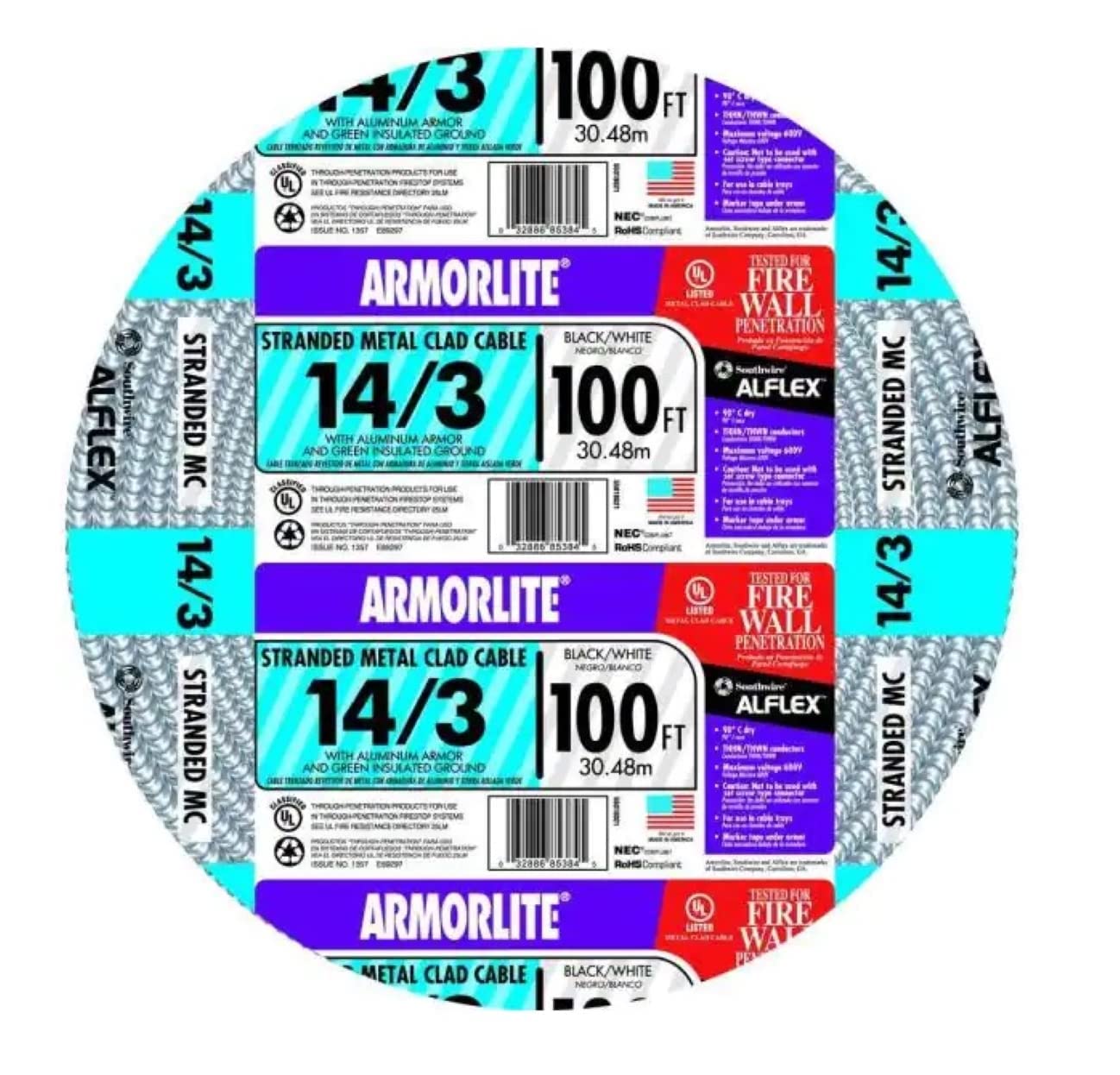 Southwire Armorlite Type MC Cable is constructed with soft-drawn copper, Type THHN/THWN conductors rated 90°C dry available in sizes 14 AWG through 2 AWG, and a green insulated grounding conductor. The conductors are cabled together and a binder tape bearing the print legend is wrapped around the assembly. Aluminum interlocking armor is applied over the assembly. 14/3 AWG THHN/THWN Insulated Singles. Green Insulated Ground. UL Listed. 600 Volts. Rated VW-1. Lightweight Aluminum Interlocked Armor.