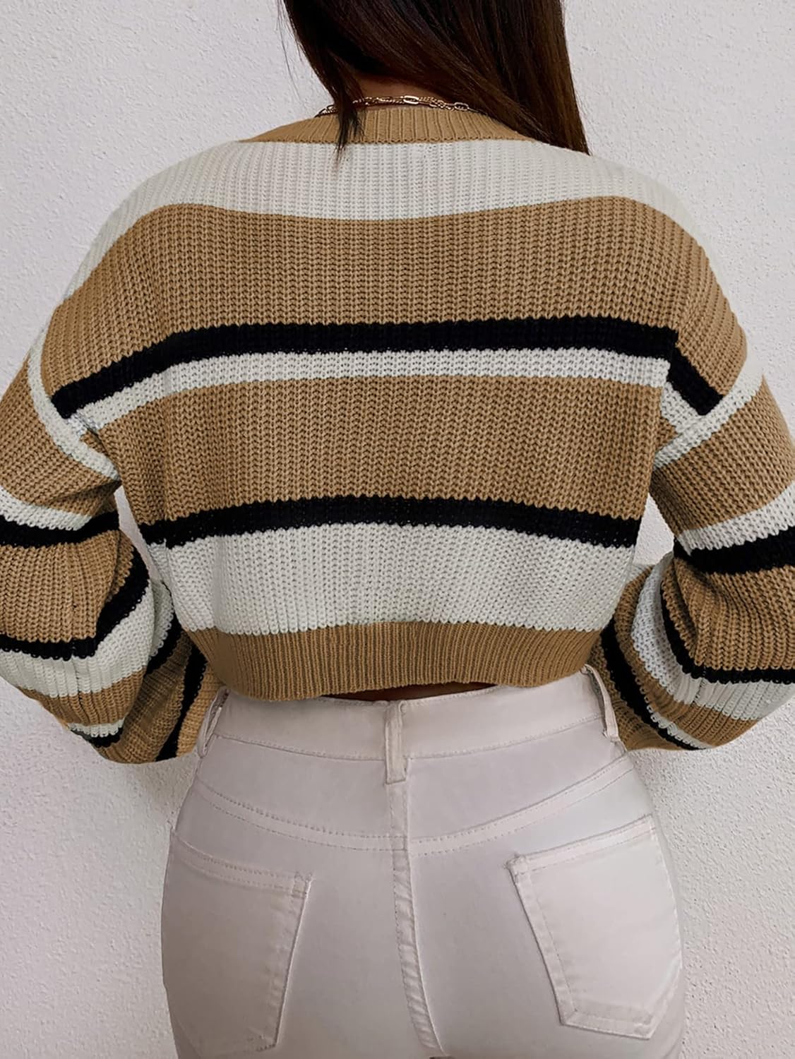 SBicep Length : 14.6 inchBust : 39.4 inchCuff : 5.9 inchLength : 14.6 inchShoulder : 20.5 inchSleeve Length : 19.7 inchMBicep Length : 15.2 inchBust : 40.9 inchCuff : 6.3 inchLength : 15 inchShoulder : 21.3 inchSleeve Length : 19.9 inchLBicep Length : 16 inchBust : 43.3 inchCuff : 6.9 inchLength : 15.6 inchShoulder : 22.4 inchSleeve Length : 20.2 inchColor: Multicolor,Light GreyStyle: CasualPattern Type: StripedType: PulloversNeckline: Round NeckSleeve Length: Long SleeveSleeve Type: Drop Shoulder,Bishop SleeveLength: CropFit Type: Regular FitFabric: Slight StretchMaterial: AcrylicComposition: 100% AcrylicCare Instructions: Machine wash or professional dry cleanBody: UnlinedSheer: NoDetails: Rib-Knit