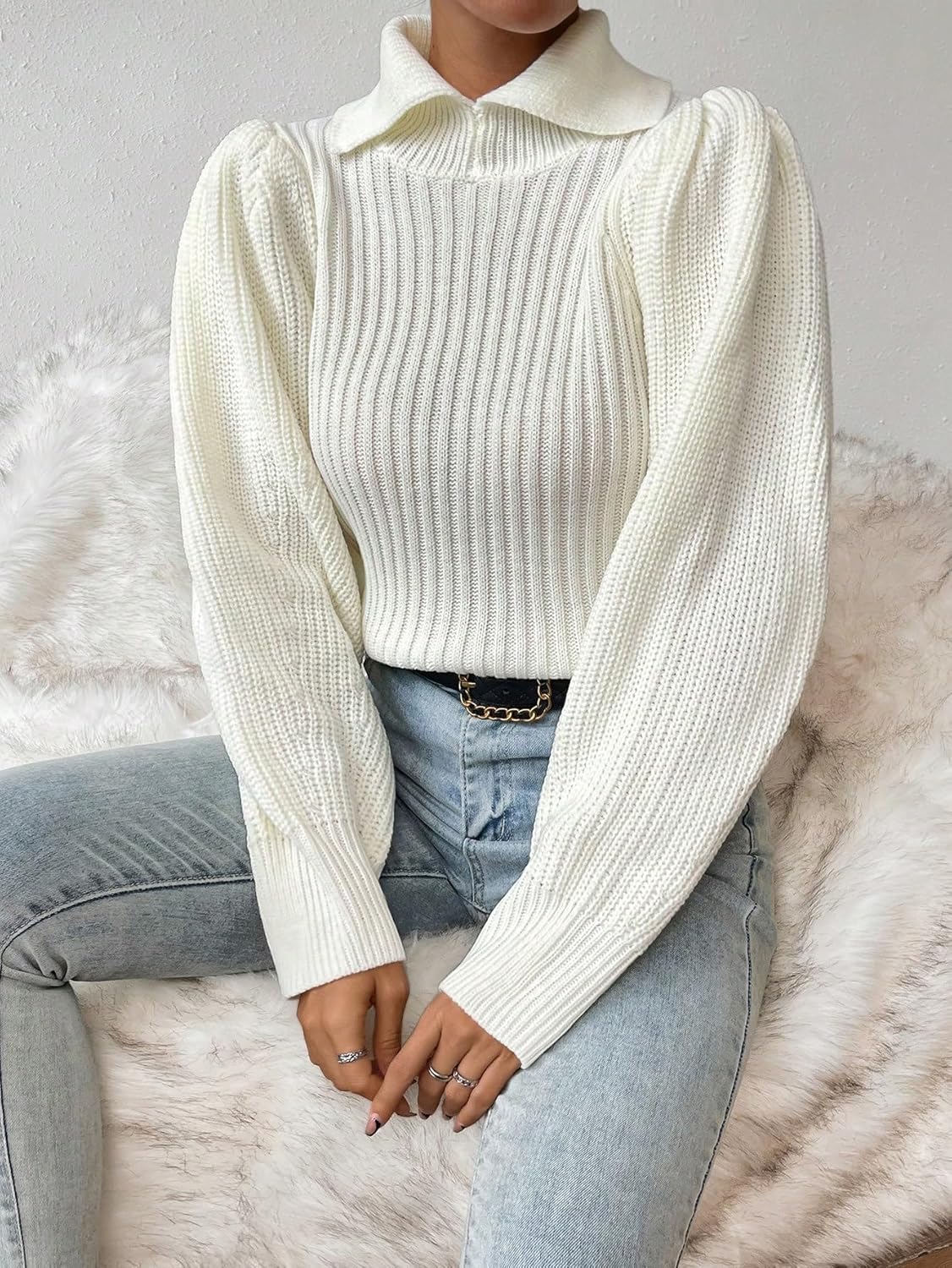 SBust : 33.9 inchCuff : 7.9 inchLength : 21.7 inchShoulder : 11.8 inchSleeve Length : 24 inchWaist Size : 31.5 inchMBust : 35.4 inchCuff : 8.3 inchLength : 22 inchShoulder : 12.2 inchSleeve Length : 24.4 inchWaist Size : 33.1 inchLBust : 37.8 inchCuff : 8.7 inchLength : 22.6 inchShoulder : 12.8 inchSleeve Length : 24.9 inchWaist Size : 35.4 inchColor: BeigeStyle: CasualPattern Type: PlainDetails: Rib-KnitType: PulloversLength: RegularNeckline: CollarSleeve Length: Long SleeveSleeve Type: Puff SleeveFit Type: Regular FitFabric: Slight StretchMaterial: WorstedComposition: 100% AcrylicCare Instructions: Hand wash or professional dry cleanSheer: No