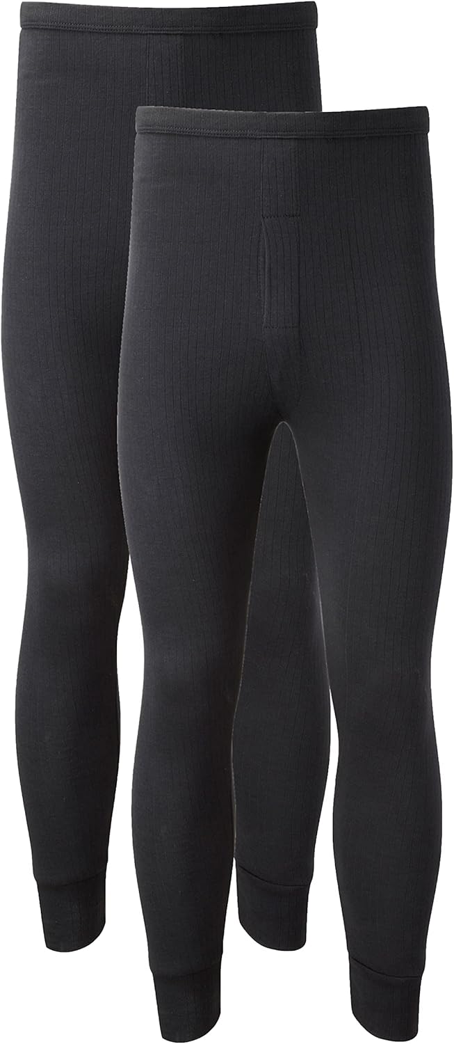 Product descriptionMen's Thermal Underwear- Pack Of 2 Long Johns0.45 TOG RATING- Hold more warm air close to the skinItem descriptionThermal underwear base layers with a soft brushed inner made from an advanced insulating yarn give them high-performance insulation.Comfort Fit, the ribbed construction shapes the contours of the body. The Tops are also side seam-free for extra comfort, Long Johns are Open Fly.Thermal Underwear Size Chart:Small - Top (Chest Size) 34-36” : Long John (Waist Size) 29-32”Medium - Top (Chest Size) 37-39” : Long John (Waist Size) 33-35”Large - Top (Chest Size) 40-42” : Long John (Waist Size) 36-38”X-Large - Top (Chest Size) 43-45” : Long John (Waist Size) 39-42"XX-Large - Top (Chest Size) 46-48” : Long John (Waist Size) 43-45”n.b. all sizes are approximateColour: White, Blue, Grey, Navy, Charcoal, and BlackMaterial: 50% Polyester, 50% CottonWashing instructions: Machine washable at 40°C, can be tumble dried, wash dark colours separately