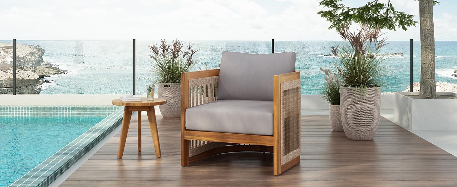 Elevate your outdoor relaxation with this premium wood club chair. Featuring a curved tub design, woven rope accents, and all weather slat construction, it combines and durability. The included water cushions ensure comfort, while the sturdy frame is built to last. patios, poolside, lounging.