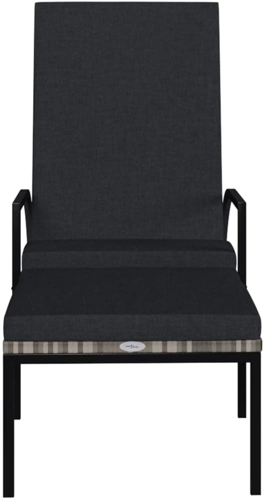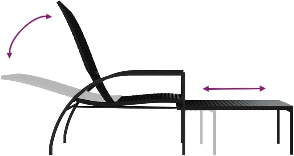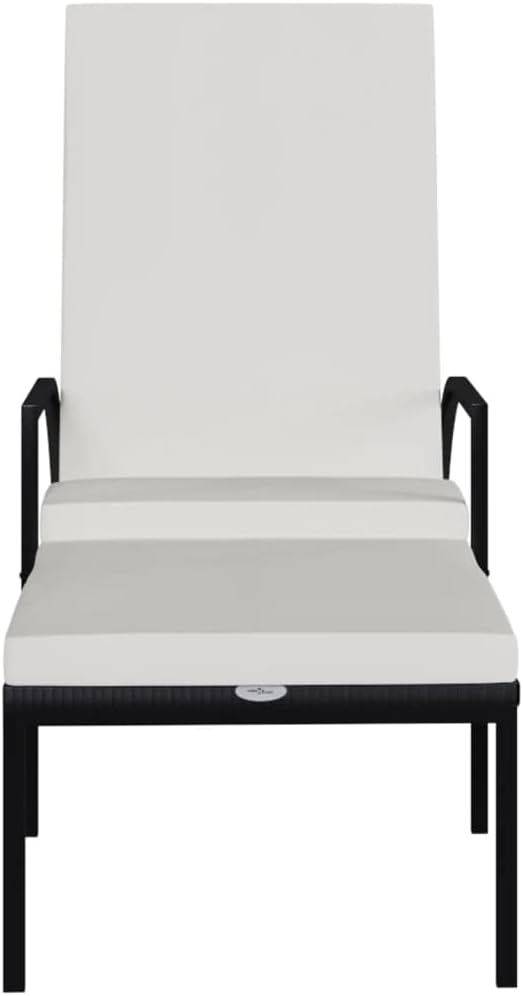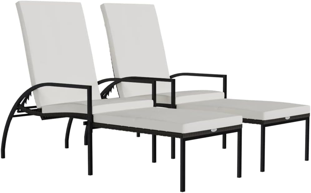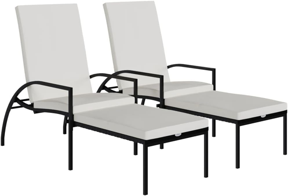 Take a load off in the garden or on the patio on these comfortable sun loungers!You can spend a relaxing afternoon in your own outdoor space, perfect for pool, balcony, garden, etc. The outdoor lounge chairs have sturdy steel frame, which make it highly durable. Its wide armrests and high backrest add to its visual appeal as well as seating or lying comfort. The backrest is adjustable so that you can lock the lounger into the desired position.In addition, the footrest allows you to really put your feet up when relaxing.Note: In order to extend the life of your outdoor furniture, we recommend you to clean it regularly and do not leave it outdoors without protection unnecessarily.Clean: Use a mild soap solutionStoring: If possible, store in a cool, dry place indoors. If the product is stored outdoors, protect it with a waterproof cover. Wipe and dry the excess water or snow from flat surfaces after a rain or snowfall. Allow sufficient air circulation to avoid moisture-related damage.Rattan color: BlackCushion color: Cream whiteMaterial: PE rattan, galvanized steel, fabric (100% polyester)Overall dimensions: 76.8" x 23.6" x 21.7"-40.2" (L x W x H)Footrest height: 13.2"Footrest width: 19.7"Seat width: 21.3"Seat height from the ground (without cushion): 14.6"Armrest height from the ground: 21.3"Assembly required: YesDelivery contains:2 x Sun lounger2 x Cushion