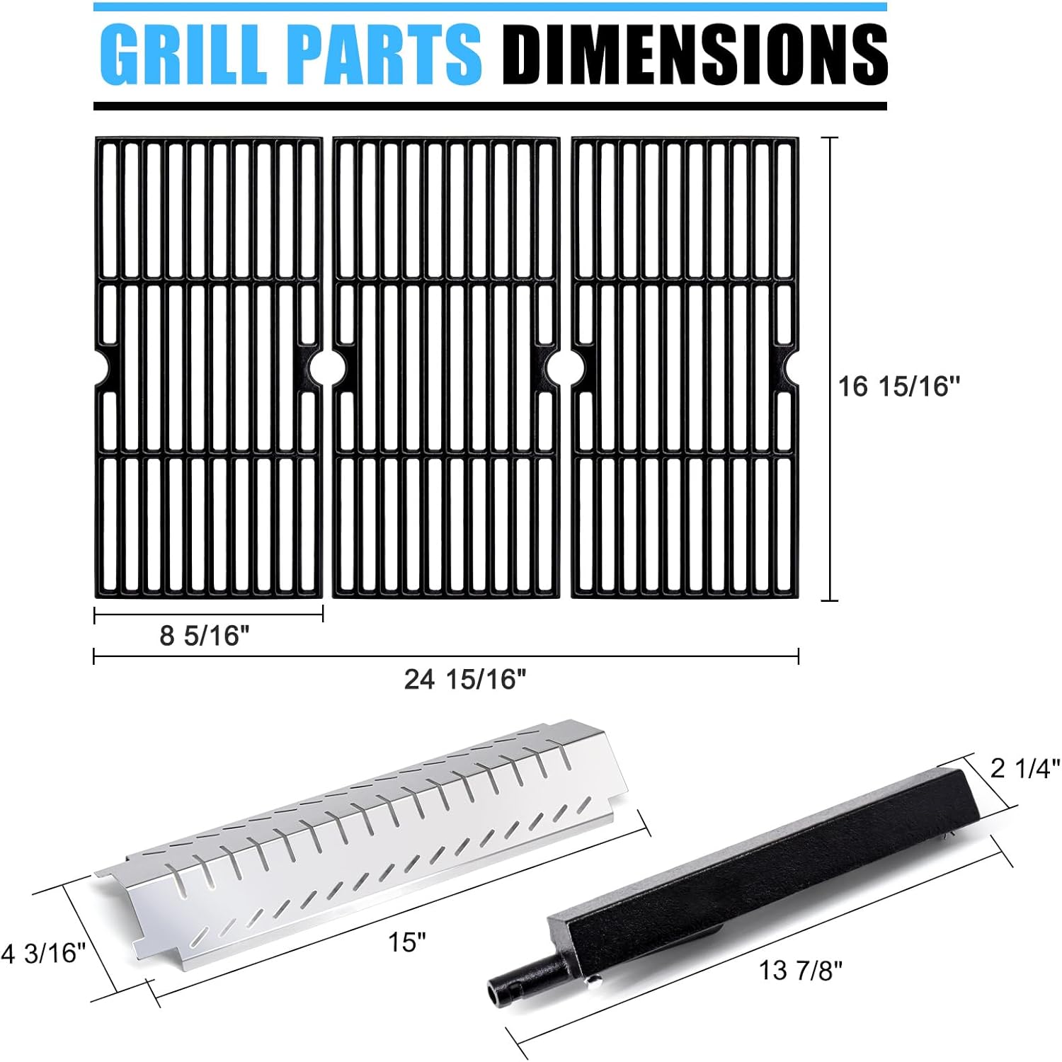 Over time, parts on your barbecue grill will wear out and rust, making your grill not work the way it is suppose to. Get your grill working again with this for charbroil commercial series 463240904 grill rebuild kit!DOES IT FIT?✔️ For Charbroil 463240904, 463251605, 463251505, 463252105, 463261406, 463240804, 463241804, 463252005, 463247004, 463261306, 463241704✔️ For Kirkland Signature Front Avenue, 463230703✔️ For Thermos 461246804, 461230404, 461230403SPECIFICATION★ Grill Burner Material: cast iron, Dimensions: 13 7/8" x 2 1/4"★ Heat Shield Material: stainless steel, Dimensions: 15 " x 4 3/16"★ Grill Grate Material: cast iron, Dimensions: 16 15/16" x 8 5/16" for each, 16 15/16" x 24 15/16" for total★ Included With Purchase: 3 grill grates, 3 replacement heat shields, 3 grill burnersADVANTAGE & BENEFIT👉Perfect fit, Work well👉Easy to install👉Much cheaper than buying locally👉Made your grill like new again👉Extend the life of your old grill