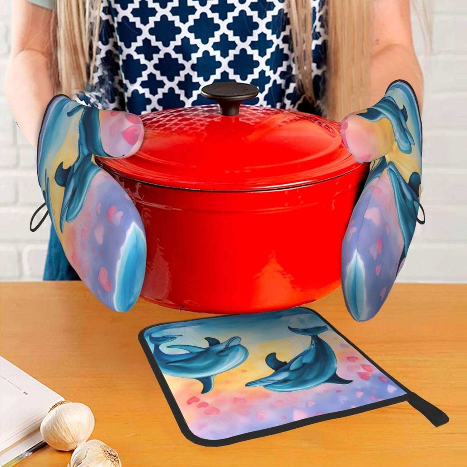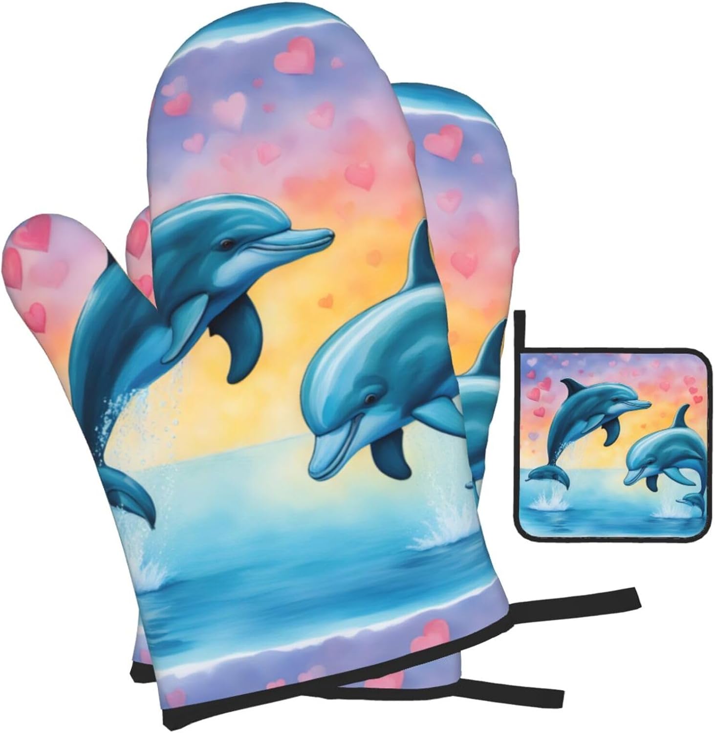 upgrade your kitchen safety with this Dolphins in Love print microwave gloves, oven mitts and pot holders sets. crafted from water repellency polyester and heat-resistant fabric, these kitchen baking three piece set offers reliable protection for hands while handling hot items. the double-layer waterproof design ensures easy cleaning after use. suitable for various cooking scenarios including microwave ovens, conventional ovens, stovetop cooking, and outdoor grilling. the side hanging rope allows convenient storage when not in use. the thick construction provides excellent heat insulation without compromising dexterity. this unisex kitchen essential combines functionality with practical design for everyday cooking needs. the heat-resistant gloves maintain comfort while offering superior protection against burns. an essential addition to any modern kitchen setup