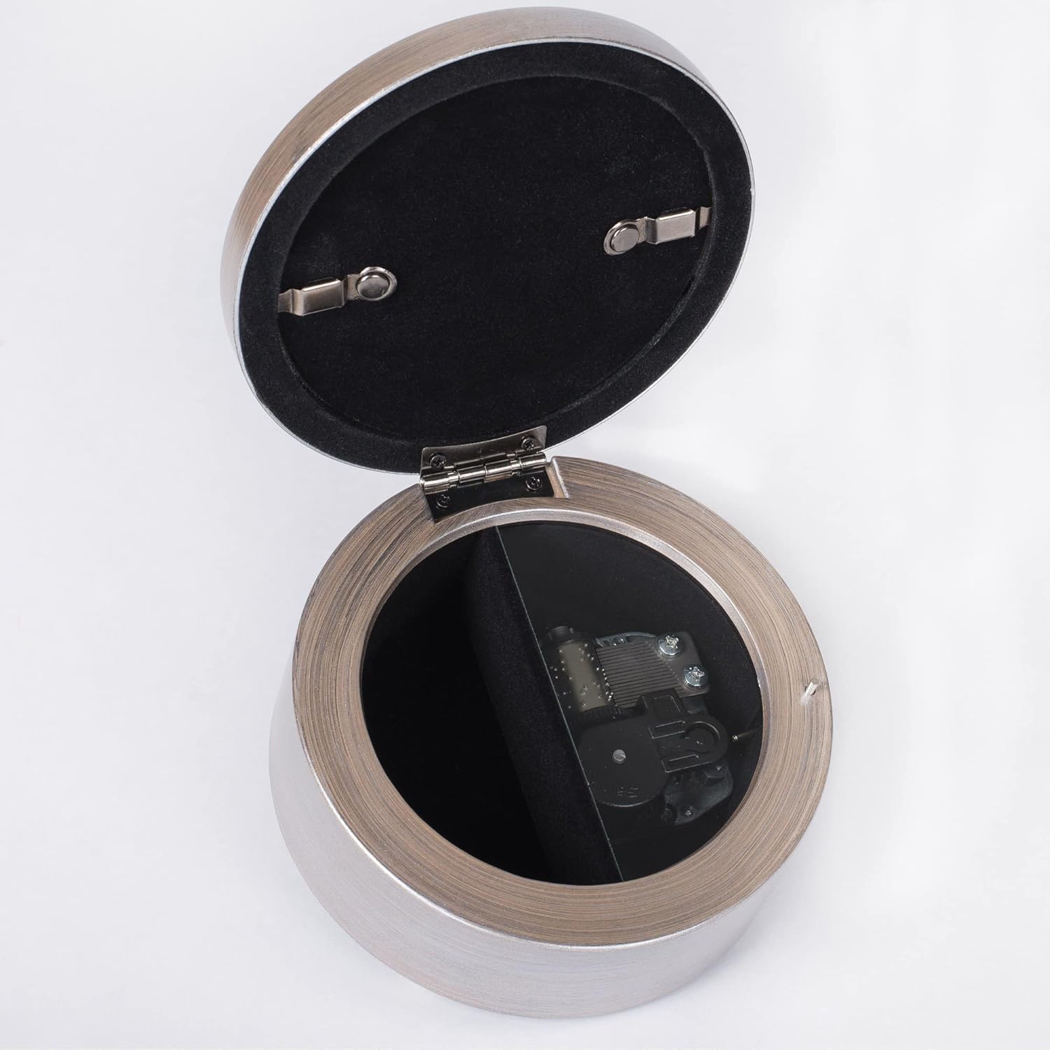 This is a beautiful round music box with a decorative beaded jewel hinged lid. There is enough room inside to hold a few bracelets, earrings, rings or necklaces. The picture can be replaced with a personal photo. It plays a high quality Sankyo music movement. Packaged carefully in a fitted bubble bag and box. Makes a thoughtful gift.