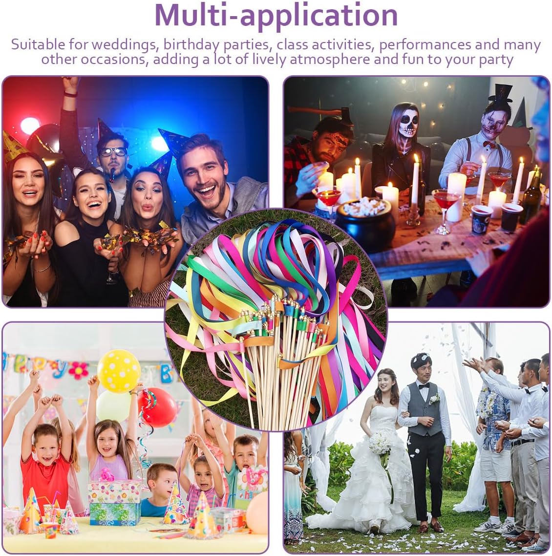 Features: Ribbon sticks are the perfect decorative accessories and props for wedding ceremony & reception, stage performance or sports meetings. The gorgeous wedding ribbon sticks are the perfect alternative to traditional confetti throws, giving the party a beautiful and romantic vibe without being messy. The tops of ribbon sticks are equipped with small bells, waving them up will give you a melodious sound, adding festive atmosphere to your party and events. These ribbon fairy sticks with bells add a festive touch to festivities and make for a great photo opportunity as a send-off. The elegant wedding ribbon sticks are very popular at weddings, birthday parties and it will create a more memorable event celebration for you to have a real prom. Ribbon sticks are widely used for wedding parties, Valentine's Day, holiday parties, intimate interactions, student games, classroom activities, shows and cheering games, celebrations, receptions, Halloween parties, etc. Specifications: Material: Ribbon and bamboo Color: Mix Color Quantity: 100 Pieces Stick Length: Approx. 11. 8 inch/30cm Ribbon Length: Approx. 23.6 inch/60cm Ribbon Width: Approx. 0.59 inch/1.5cm Package Includes: 100 x Ribbon Fairy Stick Wedding Streamers Sticks with Bells Notice: 1. Size Based on different measurement methods, there will be a slight deviation. 2. Due to the light and screen difference, the item's color may be slightly different from the pictures, thanks for understanding. 3. Winding risk may exist, please keep away from children. If any Problem Please contact us at any time, We would resolve any issue for you!