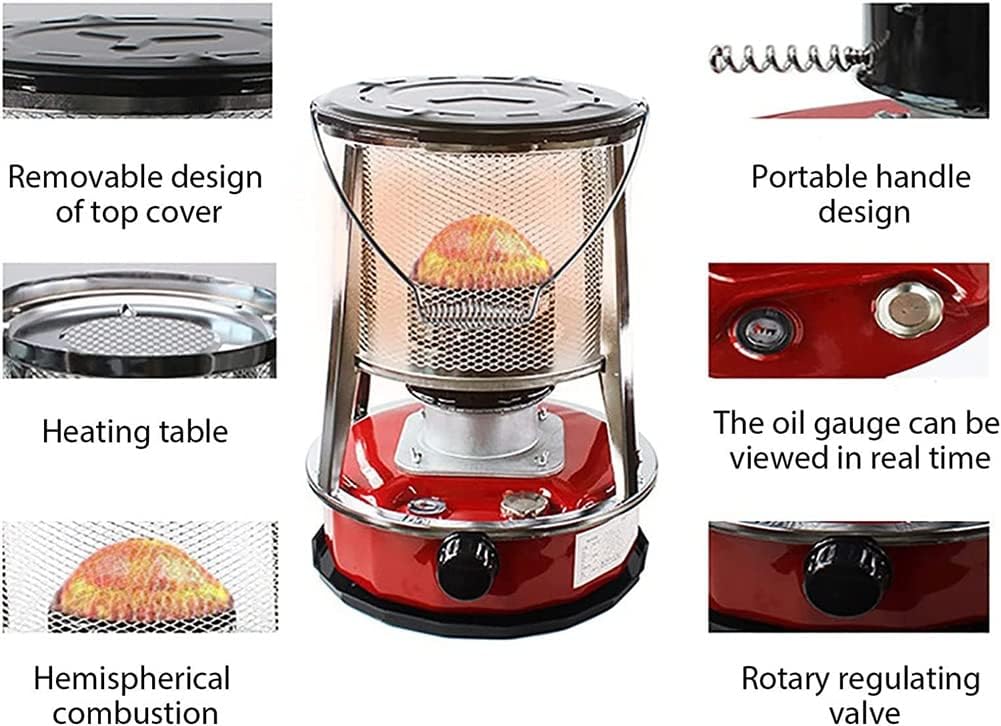 1. More Efficient Heating: The combustion chimney is made of special metal, so that the kerosene can be completely burned, and the heating is faster and more efficient.2. High calorific value: High calorific value and large heating range. The maximum calorific value is 9000 BTU/H (equivalent to 3000W), and the fuel consumption per hour is 0.25 L. Can make the space of over 20 square meters rise quickly.3. Multiple Uses: It can be used for heating, boiling water, cooking and grilling.4. Energy-saving Design: The wall-mounted stove has the effect of log fuel, no gas, no oil, and no smoke damage.Specifications:Name: kerosene heaterMaterial: stainless steelOil capacity: 4.6LOutput heat: maximum 9000BTU/HHeating area: about 20 square metersFuel consumption: 0.2~0.25 liters/hourNet weight: about 4.8kg / about 4.9kgScope of application: home, office, outdoorsPacking list:Heating stove * 1Storage bag * 1Replacement cotton core * 3Replacement knob * 1Oil pump * 1Funnel * 1 (color random)If you have any questions, you can contact us at any time and we will be at your service 24 hours a day. Thank you for choosing!