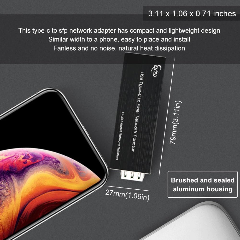 Overview:The Zhpuostd Micro-Mini USB-C to Fiber Optic network adapter is designed for laptops/PCS/tablets with Type-C interfaces that require fast and stable Internet access via fiber. Through it,the network connection is more stable and faster than Wifi access. It can provide 1000Mbps Internet access and up to 2000Mbps full duplex bandwidth capacity. And can provide a wide range of compatibility and extremely high stability, is one of your excellent choices.Features:1x100/1000 Base-XSFP Slot + 1xTYPE-C USB3.0 SlotFull duplex with flow control and half duplex with back pressure operationHighly portable design, with no need for an external power adapter (bus powered)Offer 1000Mbps Internet access, provides up to 2000Mbps full-duplex bandwidth capacity.Advanced functions like VLAN filtering packet processingSupport IEEE 802.3ad Link Aggregation Control Protocol (LACP)OS Compatibility: Windows 7,8,8.1,10,11& Windows Server 2008,2012, 2016, 2019& Linux kernel 3.5 and up - LTS Versions onlyspecification:Jumbo Frame Support: 9K max.Power: USB Bus PoweredPower Consumption: 5W MaxDimensions (WxDxH): 78 x 27 x 18 mmWeight: 46gCasing: Aluminum CaseMounting Options: DesktopOperating Temperature: 0°C ~ 60°C (32° ~ 140°F)Storage Temperature: -10° ~ 70°C (14° ~ 158°F)Relative Humidity: 5% to 90% non-condensingMTBF > 100,000 hrsRegulatory Approvals:ISO9001, CE, FCC, RoHS
