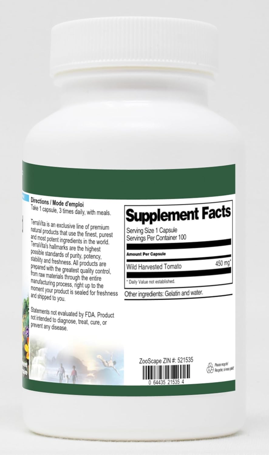 Wild Harvested Tomato - 450 mg (100 capsules, ZIN: 521535)Packaged in the United States in a GMP certified facility (Good Manufacturing Practice).No fillers.Manufacturer: TerraVitaSize: 100 capsulesEasy-to-swallow Capsules in a sealed bottle.Ingredients: Gelatin, Water, Wild Harvested Tomato - 450 mg