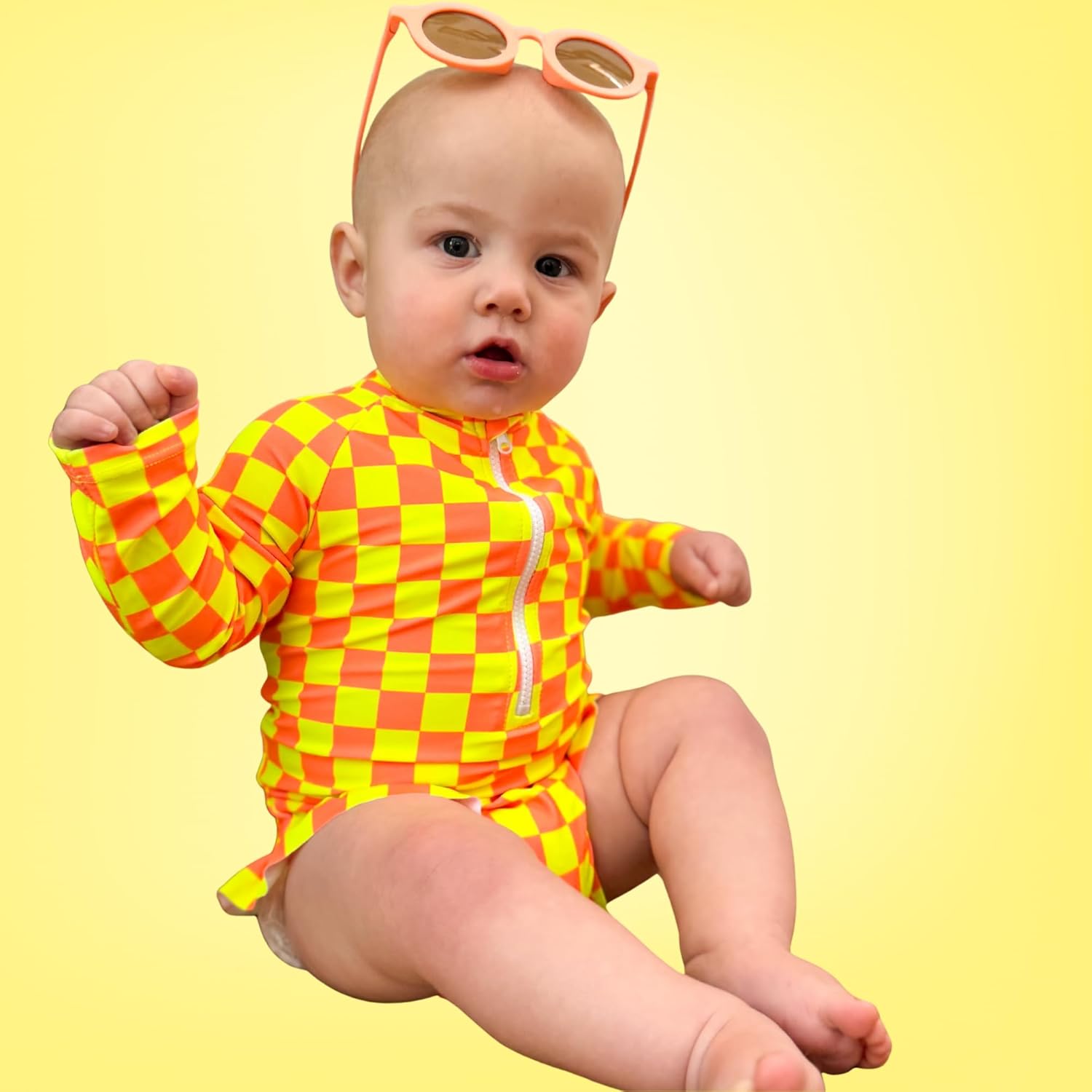 Introducing the Kiwi Punch Rashguard by Glo Surf Co — the long sleeve girls swim shirt that's as smart as it is stylish. Designed for parents who want a little extra peace of mind without sacrificing style, our high-visibility neon yellow and orange rashguard makes it easy to spot your daughter in any environment — whether she's splashing in the shallows, riding waves, playing at the beach, or swimming at a crowded public pool. No more squinting through a sea of kids trying to find yours. With the Kiwi Punch, she stands out effortlessly. Built with performance in mind, this UPF 50+ rated long sleeve rash guard blocks 98% of harmful UV rays, giving her full-arm sun protection so you can worry less about sunburn and more about having fun. Our quick-dry performance fabric is lightweight, breathable, and comfortable against the skin — it dries fast so she stays comfortable between swims and won't be weighed down by a heavy, soggy top all day long. The snug yet stretchy one piece swim shirt design stays securely in place through every dive, paddle, and somersault in the water. No riding up, no adjusting — just a great fit that moves with her. Whether she's a toddler hitting the pool for the first time or a big kid tackling her first surf lesson, the Kiwi Punch is sized to grow with her from ages 2 to 12. Please note: The Kiwi Punch runs large. We recommend sizing down one size for the best fit. At Glo Surf Co, we believe kids should be seen — literally. Our high-visibility swimwear line was built for active families who spend real time in and around the water and want both style and safety in every piece. The Kiwi Punch Rashguard is the perfect addition to any girl's swim bag, beach kit, or vacation packing list. Makes a great gift for birthdays, holidays, or any occasion for the little water lover in your life.