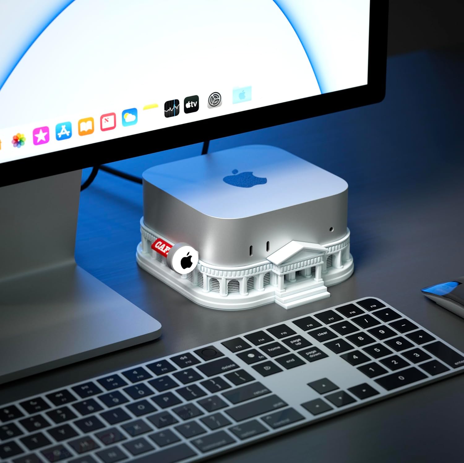 Original design, 3D printed dust-proof stand, designed specifically for Mac Studio and compatible with Mac Mini M1/M2. This Mac Studio base is equipped with a built-in filter screen, which can be disassembled and washed for reuse. It can block animal hair and dust from entering without affecting the machine's heat dissipation. The unique shape design of the Dust-proof base perfectly matches the machine, and the interior can be DIY installed with light strips to create a full atmosphere.