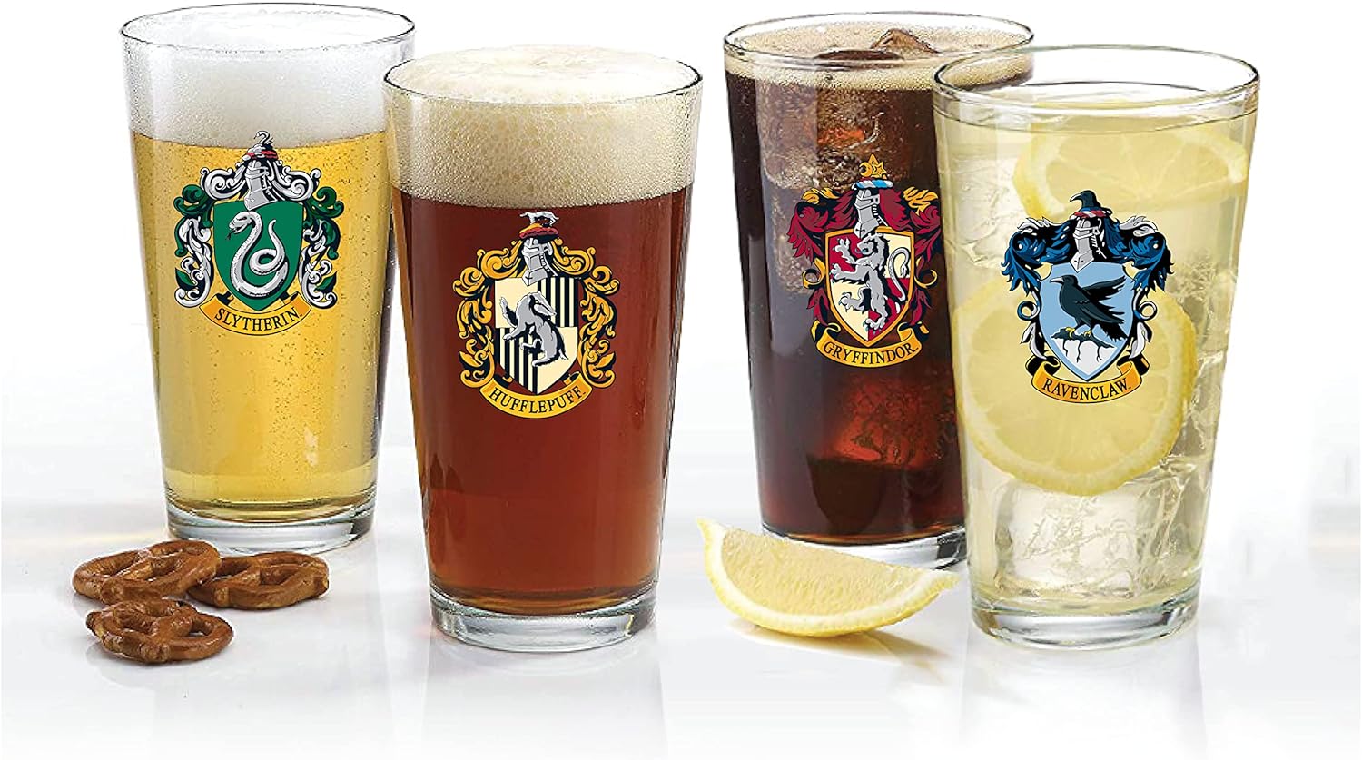 Choose your favorite house with this Harry Potter Pint Glass Set! Features 4 different 16 oz. pint glasses, each showcasing the official crest of a different Hogwarts House: Gryffindor, Slytherin, Ravenclaw, and Hufflepuff.
