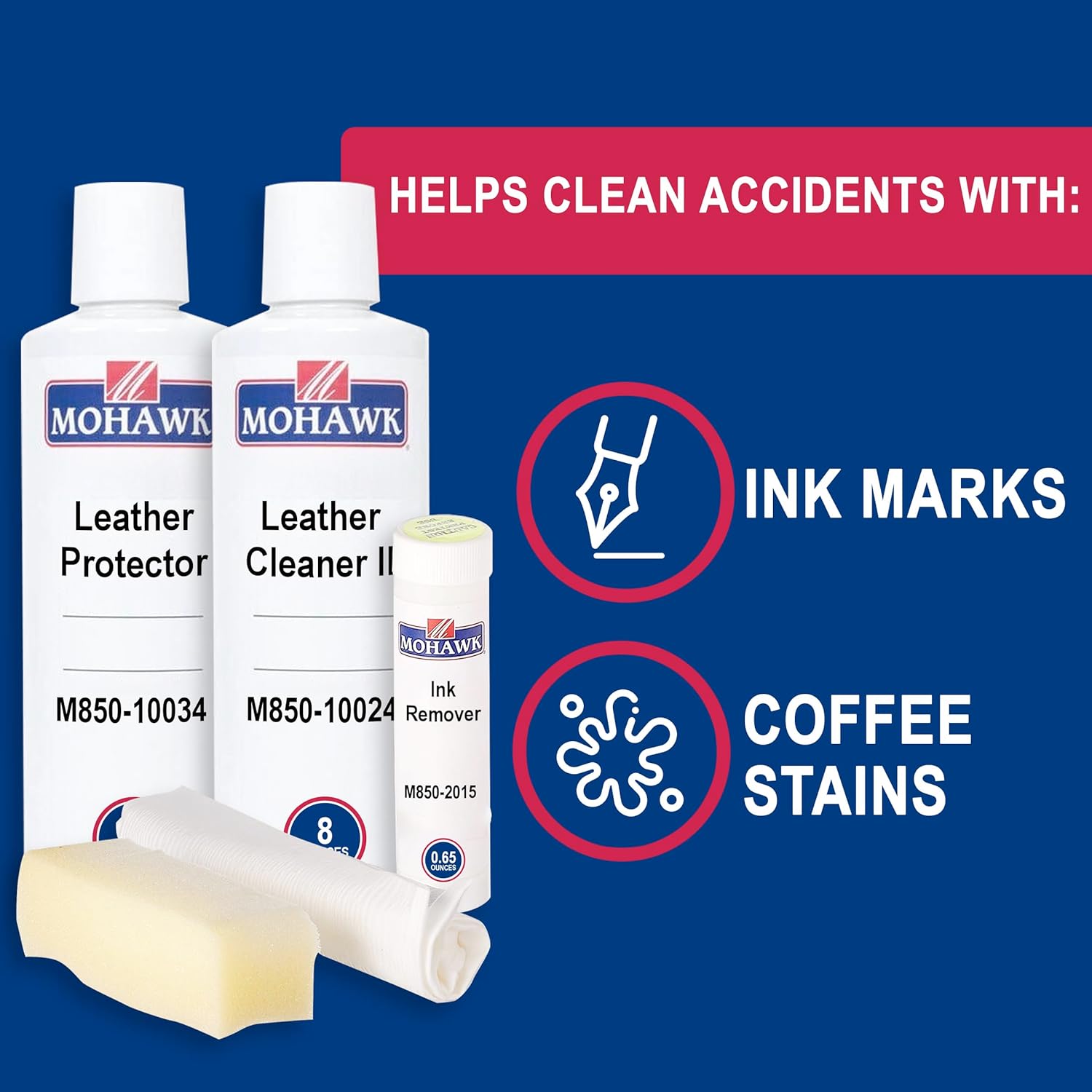 Mohawk Leather Care Kit provides the tools you need to help minimize the appearance of scrapes and blemishes on your leather furniture, upholstery and accessories so you can enjoy your favorite leather recliner or pair of shoes longer. This kit includes one Leather Cleaner II (M850-10024), one Leather Protector (M850-10034), and one Ink Remover (M850-2015.) The water-based leather cleaner gently washes furniture, while the leather protector provides added protection against cracking, peeling or discoloration throughout time. Sit confidently and worry-free in your white leather car seat, knowing you can spot clean accidents with the ink remover for leather to help remove recent ink marks or lipstick stains. Stains must be three to five days old for optimal results. Use as a leather repair kit car interior, as this care kit is perfect for pigmented (top-coated) leather and aniline leather. Use it on leather upholstery as a leather cleaner for couch or chair; you also can use it to tidy up other accessories, such as leather shoes or leather satchels. Apply approximately once per month for leather repair of furniture in high-traffic areas. When used together routinely as a team, these leather treatments help refresh your leather furniture, making them great for DIY home improvement projects. Not intended for use on nubuck or suede.