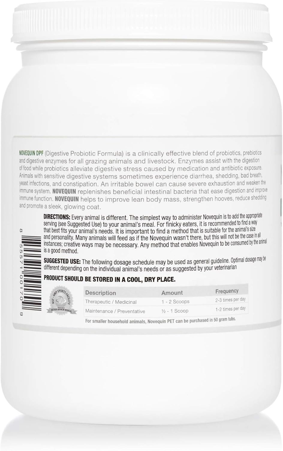Anxiety, stress, physical strain, and ageing all contribute to the health of your large animal's digestive health and wellbeing. Novequin DPF was developed to help keep your large animal's digestive system happy, healthy, and working well through a proprietary blend of all-natural prebiotics, probiotics, and enzymes. With ingredients like protease to break down proteins, amylase to digest starch, and hemicellulase and cellulase to break down fiber, Novequin DPF aids in alleviating stressor-related issues like diarrhea, shedding, bad breath, yeast infections, and constipation through your animal's entire life cycle.