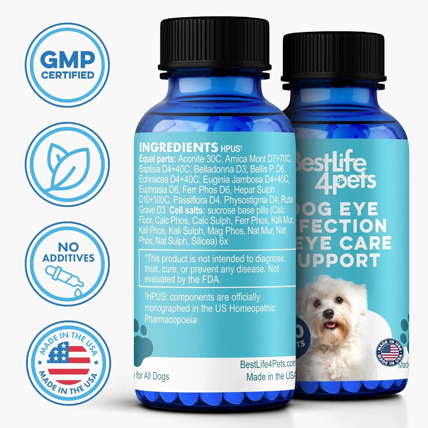 Holistic, Head-to-Tail Health With BestLife4PetsYour furry friends are more than just pets, they're part of the family so seeing them struggle from poor eye sight and declining health is hard on any pet parent. But giving supplements with artificial ingredients disguised as treats or administering repeated doses of medicine that doesn't stop the problem can be just as difficult. That's why at BestLife4Pets, we create gentler alternatives to modern medicine with holistic dog and cat vitamins and supplements. Made to strict standards with quality, clean ingredients, they're proven to help your pets without causing more problems.Tail-Wagging Eye-Health SupplementsWatery eyes, infections, cherry eyes, and cloudy vision can cause discomfort, and may even lead to blindness. Promote optimal eye health with vision support pet supplements by BestLife4Pets that help Fido's body to heal itself with homeopathic plants and minerals.As-needed Eye CareAll your puppy or senior canine needs for sight support is a few tiny pills 2-3 times a day! Infrequent infections? - Supplement their diet only when they have ocular discharge or discomfort.Recurring eye infections, weak immunity, or recurring respiratory issues? - Give daily.Easy to TakeGiving pets pills isn't always easy. That's why your eye care pills for dogs can be taken in 3 different ways!—Place the pills right in their mouth.—Hide the holistic supplements in food or snacks.—Dissolve the flavorless pills in water.No Problems With PrescriptionsDon't worry if your pup's already on medication. Your dog care pills have no contraindications and can be safely taken with other vitamins or medicine. Plus they have a long shelf life.Help your pup see clearly and be pain free today with BestLife4Pets Eye Care and Vision Support for Dogs!