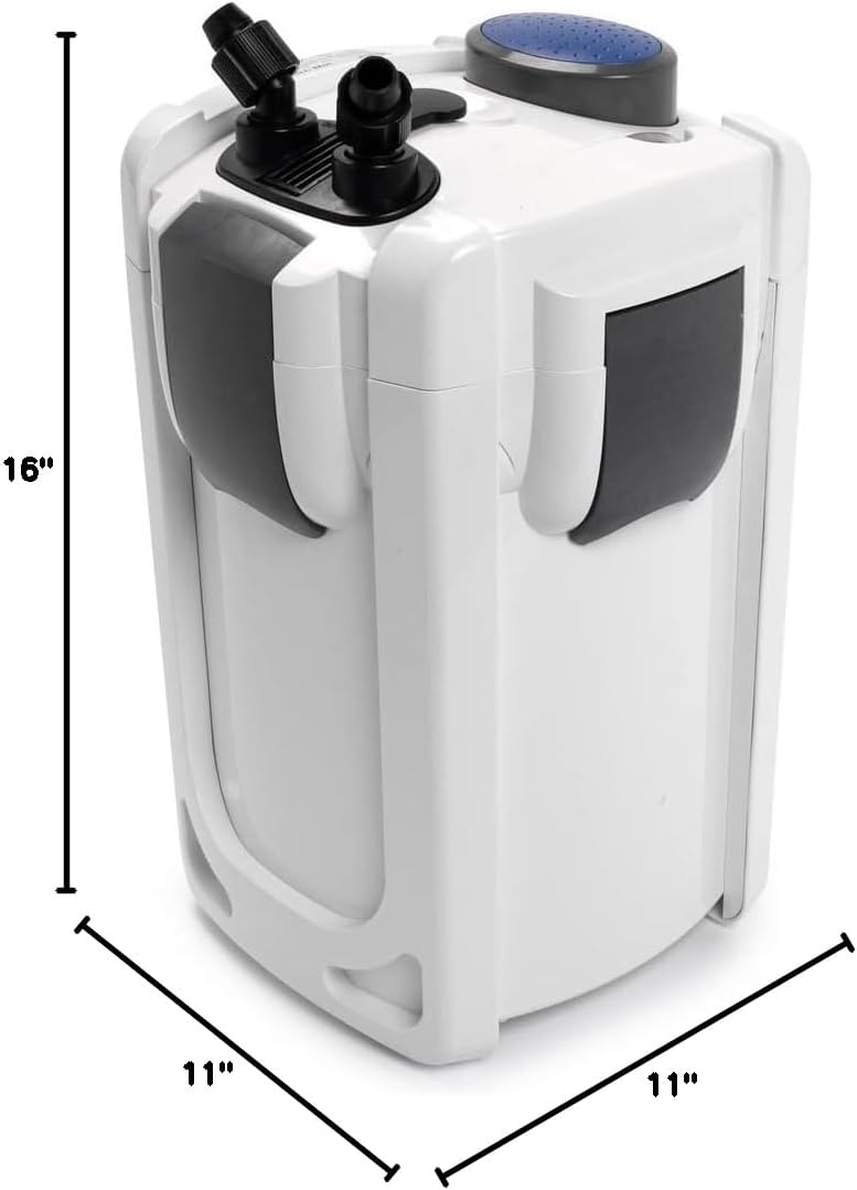The SunSun HW-703B is a powerful multi-stage external canister filter designed to keep aquarium water crystal clear and healthy. With a flow rate of 370 GPH and a built-in 9W sterilizer, this filter is suitable for aquariums up to 100 gallons. Its layered basket system allows for customizable mechanical, biological, and chemical filtration.Key FeaturesMulti-Stage Filtration – Three internal baskets for layered filter media (mechanical, biological, and chemical).Integrated 9W Sterilizer High Flow Rate – 370 GPH for effective water turnover.Spray Bar Outlet – Improves oxygenation and circulation.Quiet & Efficient Operation – Reliable filtration with minimal noise.Easy Setup – Includes inlet tube, outlet tube, and spray bar.Filtration StagesMechanical Filtration – Filter pads trap debris and particles.Biological Filtration – Bio-balls and ceramic rings support beneficial growth.Chemical Filtration – Activated carbon absorbs impurities and odors.SpecificationsModel: SunSun HW-703BFlow Rate: 370 GPHTank Size: Suitable for up to 100 gallonsDimensions: 11″ L × 11″ W × 16″ HPower Supply: 110V (US plug)Media Baskets: 3 customizable baskets