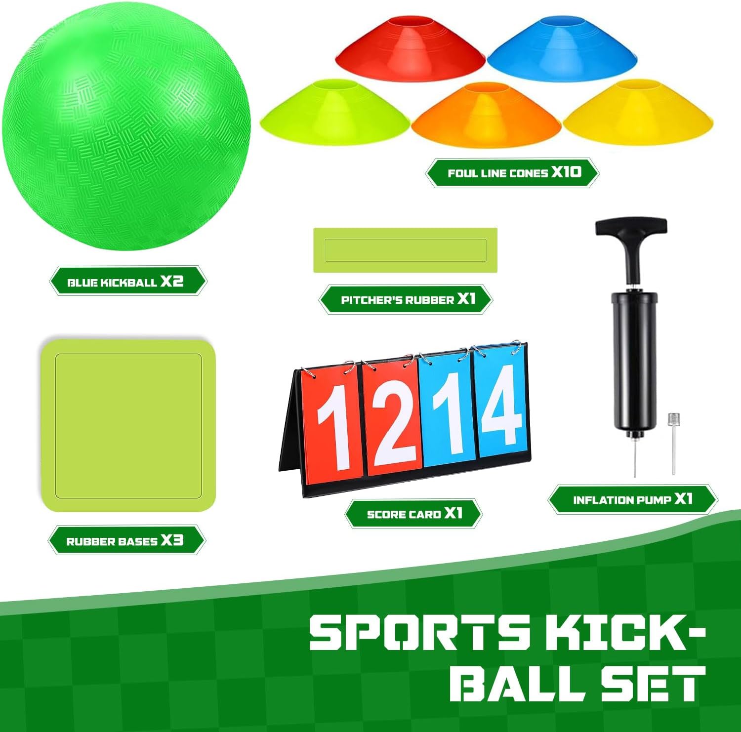 COMPLETE KICKBALL SET: The package come with 2 pieces of 9" balls, 10 pieces of foul marker discs, and 5 pieces of bases for kickball, an air pump and a scoreboard, our kickball set is the ideal combination to meet your needs, enough to make you and your friend have fun.