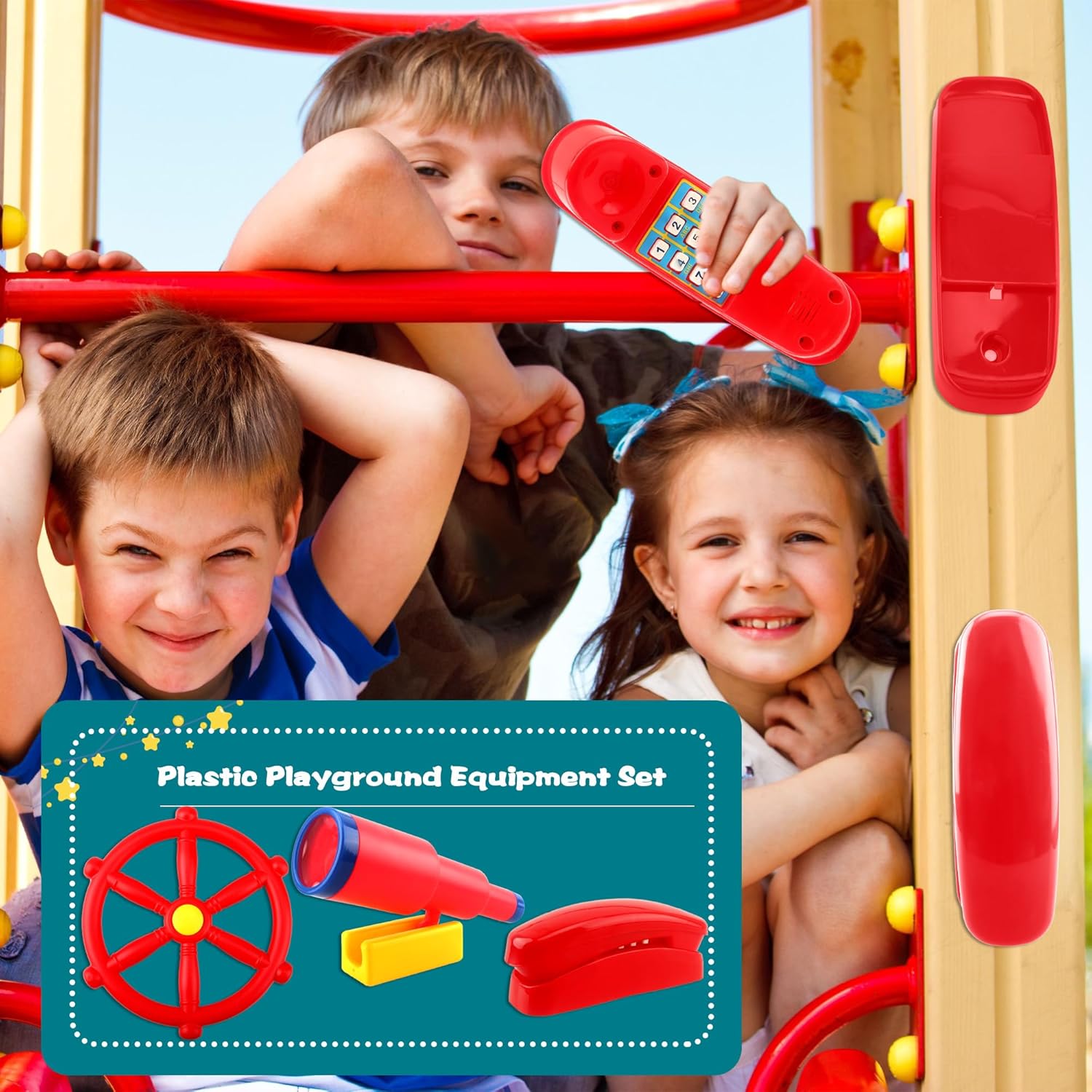 3 Pack Kids Playground Accessories Pirate Ship Steering Wheel Plastic Steering Wheel Swingset Telephone Plastic Telescope for Kids Outdoor Playhouse Treehouse Playset Interesting design: the pirate ship steering wheel can rotate 360° freely after installation, children can exercise while playing, the swing set phone designed with old-fashioned number keys, the toy telescope comes with a base fixation, bright colors and interesting design let your child enjoy the fun, bring hours of entertainment Specification: Material: plastic Color: as the picture shown Quantity: 3 packs Package include: 1 x Pirate Ship Steering Wheel 1 x Swingset Telescope 1 x Toy Telephone Note:suitable for children over 3 years old