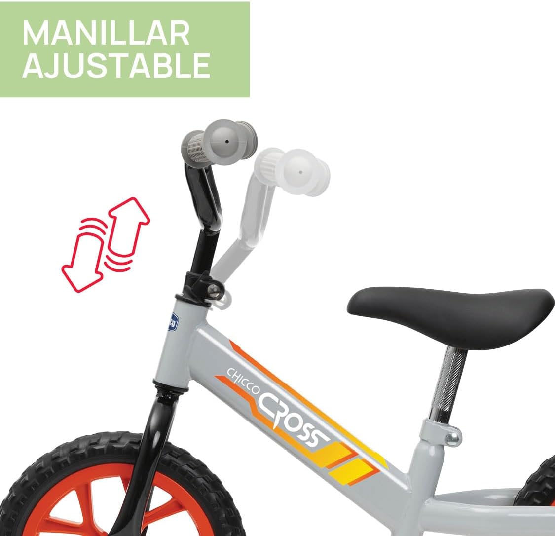 THE FIRST Chicco BIKE WITH CROSS COUNTRY DESIGN: Enjoy your first outdoor rides with the first Chicco Cross balance bike, inspired by the MTB XC. New design and shape of tyres and rims: the frame and wheels are larger, to support the weight of the child up to a maximum of 25 kg, maximum height: 59 cm. Handlebar and saddle are adjustable. The seat is comfortable and wide, the handles are made of rubber and therefore non-slip, for the little ones. The bike is equipped with puncture-proof tyres that do not need to be inflated, for a smoother and safer ride.