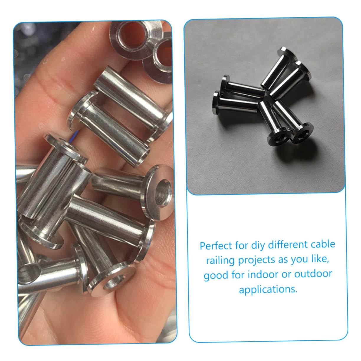 Package List 80 x balustrade cable protectors 1 x drill bit Features -Size: 2.00X1.22X1.22cm/0.79X0.48X0.48in stainless steel cable railing. -Color: Silver wire deck railing -Material:T316 Stainless steel wire railing kit for decks - The protective sleeves apply for both wood posts and wood posts with sleeves, for outdoor and indoor cable railing system. - Made of T316 Stainless steel material, and made by fine workmanship, making it for long-term use steel cable railing kit. - Come with a drill bit to help you drill holes easily to create a clean look and add a nice touch to deck railing deck cable railing. - These protector sleeves are applicable to 1/8" cable railing, for DIY your own cable railing project cable protectors. - workmanship, its popularity and utility, provide you with a longer serving life sleeve protectors.Goods Descriptioncable deck railing system A for protecting deck cable.decking railings If you are looking for a wire rope protector for deck stair wood post, then you should not miss our product.cable protectors Made of T316 stainless steel, and .rope protector sleeve The texture is firm and the surface is smooth, which is very