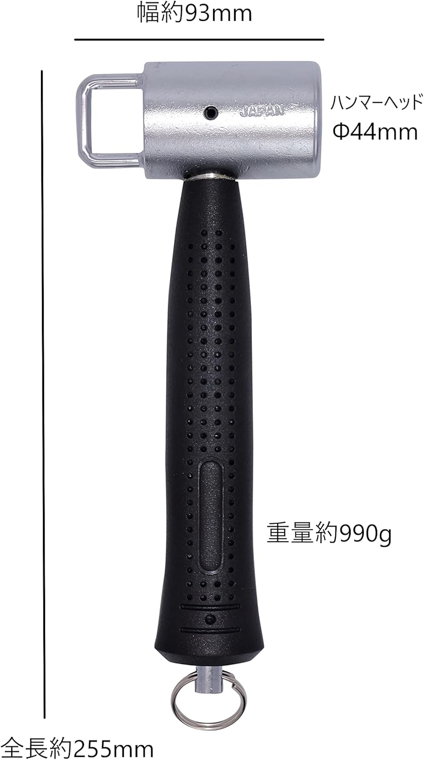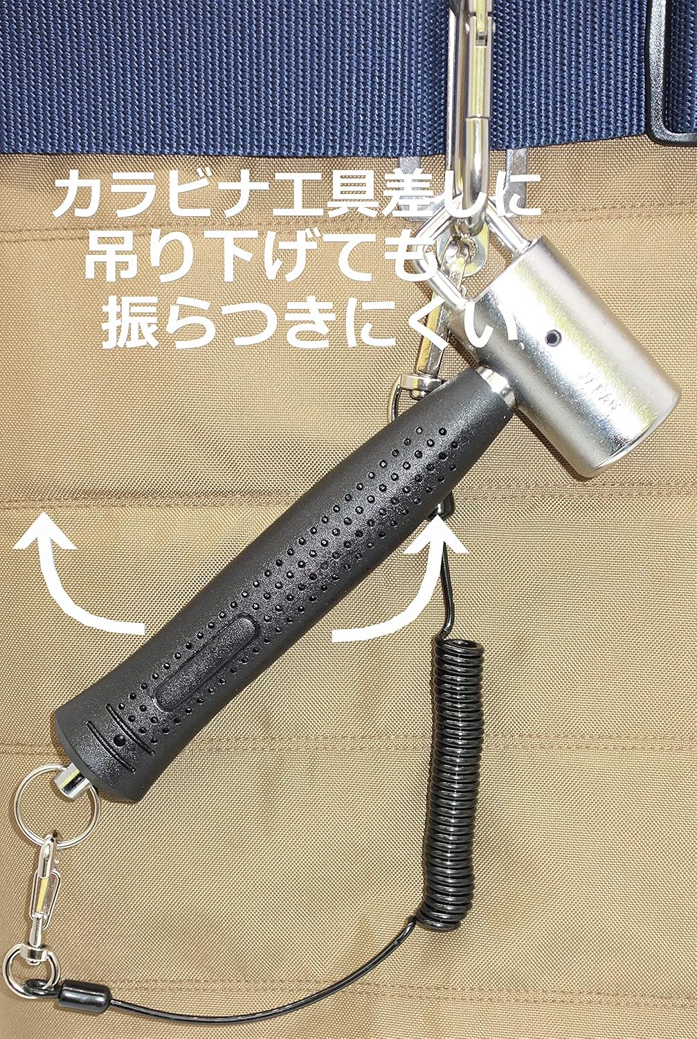 Comes with a large hook that can be removed with one hand with a carabiner tool holder. Short grip (short handle for easy handling. When attached to a carabiner, the grip part is diagonally and does not vibrate, and it becomes an angle that is easy to grip when putting on and taking off. By twisting the hammer head, you can remove it from the carabiner tool holder with one hand. Drop prevention cord can be attached to the safety ring on the grip end. The head and grip are connected with wire to prevent the head from falling out. Hammer Head Diameter: 1.7 inches (44 mm) Total length: about 255mm Width: about 93mm Weight: about 990g Made in Japan Carabiner tool insert and drop prevention cord sold separately.