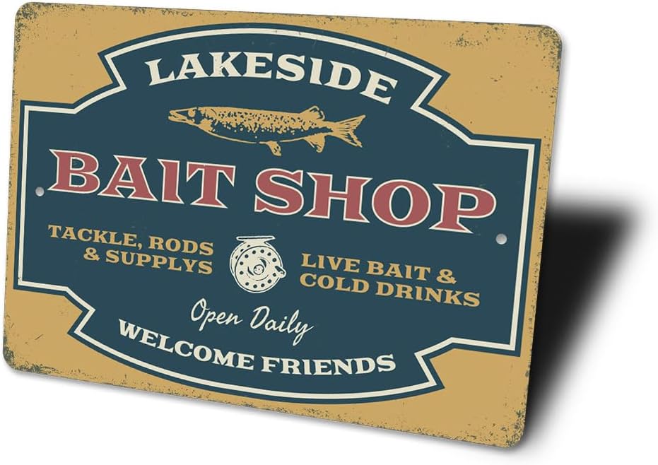 SKU:5555-Lakeside Bait Shop Tackle Rods Welcome Friends Sign - 12" x 18"Complete your home decor with our unique signs, or give as a family gift to friends! Our novelty signs are an excellent choice for wall decor, made of rustproof, Sturdy Aluminum.All of our street signs are made of Premium Materials, purchased within the USA. The sign itself is made of aluminum and will never rust providing years of enjoyment indoors and outdoors. No Cheap plastic!Conveniently placed pre-drilled Holes for easy mounting, which gives you more time to remodel your Pub, Man Cave, Bathroom, Home, Store, Garage or even your yard!All of our concepts, processes and designs are proudly Made in the United States, in our shop in the heartland of the USA, in Lizton, Indiana.The Lizton Sign Shop is a family ran and operated business. We enjoy what we do and feel it shows in the finished result. We look forward to serving you and enjoy the relationships we have created over the years with all of our customers. Click "Add to Cart" to grab this sign now! All content and designs are subject to copyright and may not be reproduced in any form. Goods & Services 2002-Present The Lizton Sign Shop