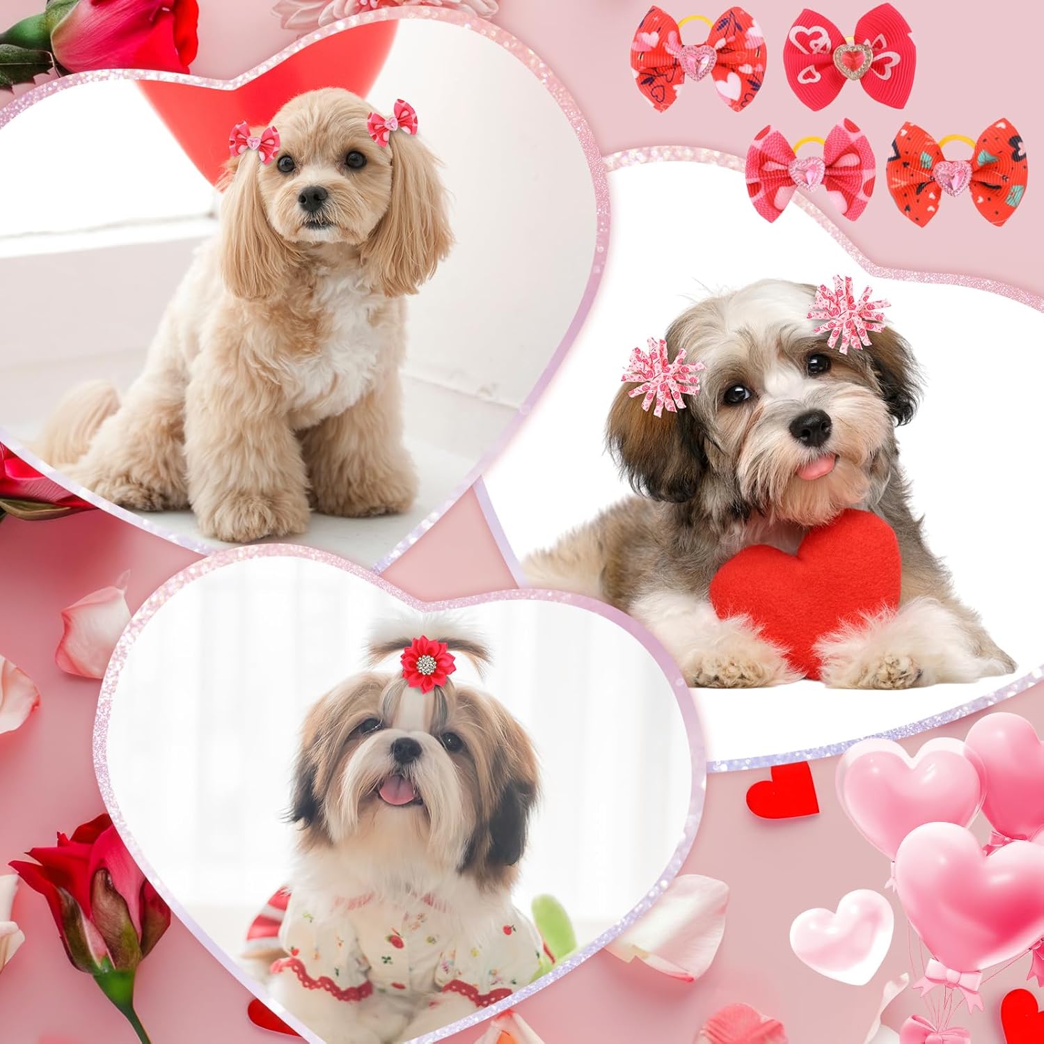 • Attractive Size: valentine hair bow's width is about 1.73 inch/ 4.4 cm, flower diameter is about 1.57 inch/ 4 cm, lightweight and portable, easy to carry and store; Meanwhile, featuring nice rubber elasticity (stretchable to 2.8 inch/ 7 cm), are suitable for most small, medium dogs or other animals
