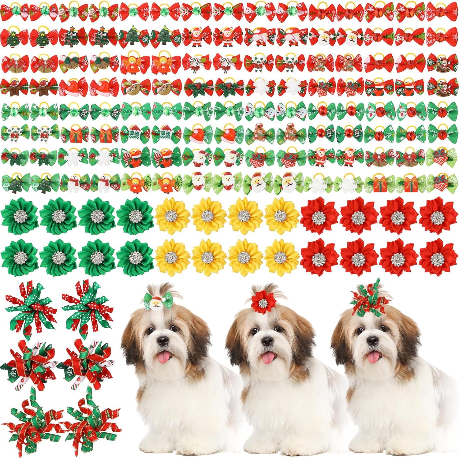 Features: Owing to nice material, our rabbit bows are lightweight and easy for your pets to wear. Besides, they are also easy to store without occupying much space. These hair bows for dogs can be practical presents for family, relatives, neighbors, mates and more, who own pets, adding a strong party atmosphere to you. Specifications: Quantity: 150 pcs Size: Bow width: about 1.73 inch/ 4.4 cm Flower diameter: about 1.57 inch/ 4 cm Color: red, pink and green Material: polyester and rubber Package includes: 150 x Pet hair bows Warm notes: Please allow a little error on the size due to manual measurement. The color might have a slight difference due to different displays. Please measure the size of your pet before purchasing. Do not squeeze too tight, keep it loose. If your pet feels unwell, remove it immediately. Requires pet owner supervision when worn. Small parts are included. Pet owner supervision is required Small items are included, please keep them away from pets in case of choking risk. Before purchase, confirm whether the product size is suitable for your pet, and observe the pet's reaction when using. Please remove the product in time if there is any discomfort