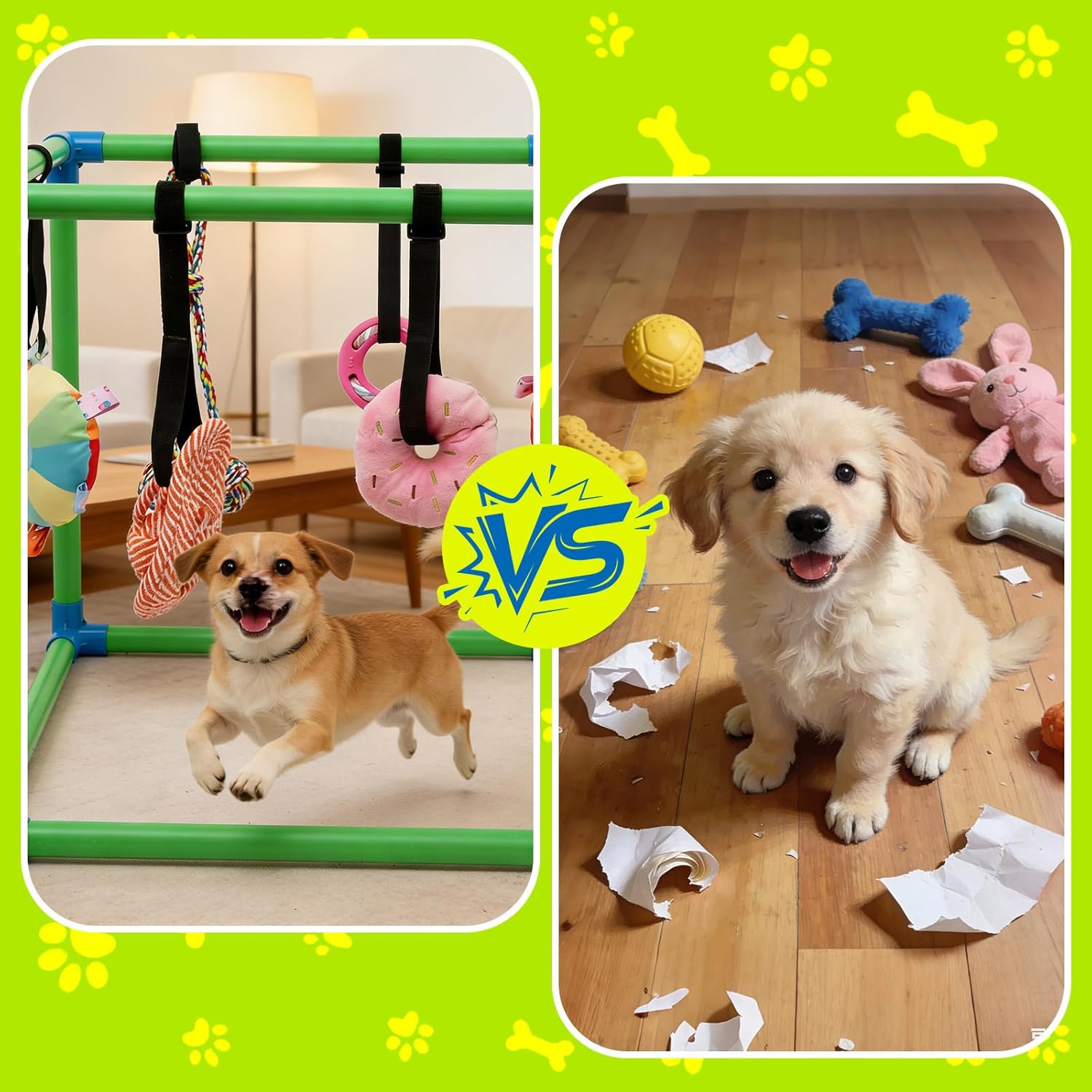 Help your energetic puppy burn energy, build strength, and enjoy independent play with the Dewonch Puppy Play Gym—a thoughtfully designed jungle gym for puppies 0–6 months. Built with a sturdy PVC cube frame, this play gym includes 8 interactive toys hanging from elastic Velcro straps, allowing playful tugging, chewing, and swatting action. It’s a safe and engaging way to support teething, jaw development, and mental stimulation. This indoor dog activity center sets up in minutes, fits inside most whelping boxes, and can grow with your puppy—just adjust toy heights or add more toys as needed. Whether you're looking for toys to keep your pup busy, or a creative way to enrich their environment, this jungle gym does it all.