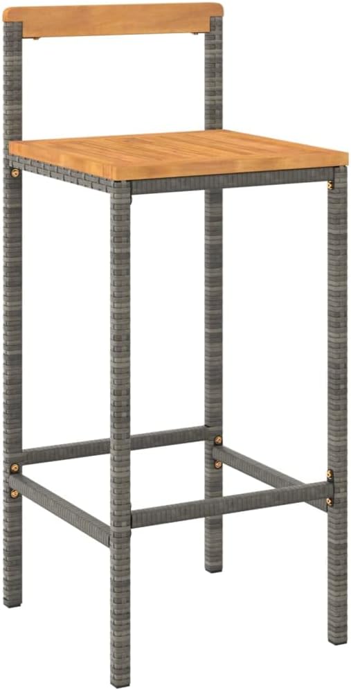 This trendy garden bar set, combining style and functionality, is sure to be the centerpiece of your garden, patio and any other space. WEATHER RESISTANT MATERIAL: PE rattan, also known as synthetic rattan, is weather resistant and easy to clean. The outer part stays beautiful for a long time. It offers great quality, comfort and aesthetic appearance. Practical table: The high table is ideal for placing drinks, snacks and your favorite ornaments. Sturdy and stable structure: Powder coated steel structure makes the bar set sturdy and stable for daily outdoor use. Wide uses: The table and tall stools, with a remarkable design, create a nice overall style that integrates effortlessly into any environment. Useful information: For maximum installation, each product is delivered with a manual. Note: To make sure your outdoor furniture stays beautiful, we recommend protecting it with a waterproof cover. Color: Grey Kitchen stool: Material: PE rattan, powder coated steel, solid acacia wood with natural finish Dimensions (each): 40 x 44 x 100 cm (L x W x H) Seat dimensions: 40 x 44 cm (W x D) Seat height from the ground: 78 cm Max. Load capacity (per seat): 110 kg Max. Load capacity (per seat): 110 kg Bar table: Material: PE rattan, powder coated steel Dimensions: 100 x 60.5 x 110 cm (L x W x H) Delivery includes: 1 x Bar table 4 x Bar stools
