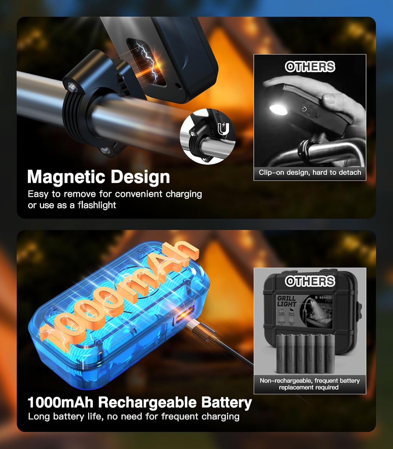 Orbecco Rechargeable Light for Grill—Illuminate the Grill, Barbecue at WillUniversal Compatibility· Includes round and square stands to fit most grills and carts with handle· Round stand is compatible with most models of Weber, Blackstone griddles, and stainless steel grills· Square stand fits most models of Weber, Big Green Egg, camping grills, and various outdoor grillsLong Battery Life & Convenient Charging· Built-in 1000mAh battery offers 6-20 hours of runtime per charge· Universal Type-C port supports reusable charging without battery replacement· Ideal for all-night gatherings or multi-day camping tripsMulti-Function Lighting· Detachable magnetic design, works as a standalone light· Dual color temperatures and 6 lighting modes· White light for grilling, warm light for ambiance, flashing mode for emergenciesSmart Auto-On/Off· Built-in sensor automatically turns on/off with the grill· No manual operation required, saves your energy and effort· Lets you focus on cooking and enjoy a hassle-free experienceWater-Resistant & Long Lasting· IP44 waterproof rating with high-impact ABS material· Silicone seals protect screw holes and battery cover from splashes· Reliable for outdoor use, practical gift for grilling enthusiastsPackage Includes: 1 × Barbecue grill light1 × Round stand1 × Square stand1 × Cleaning cloth1 × Storage bag1 × Screwdriver1 × Charging cable