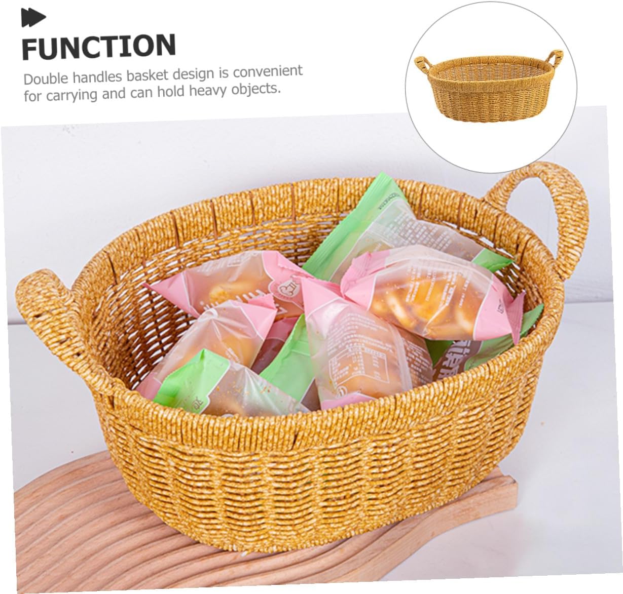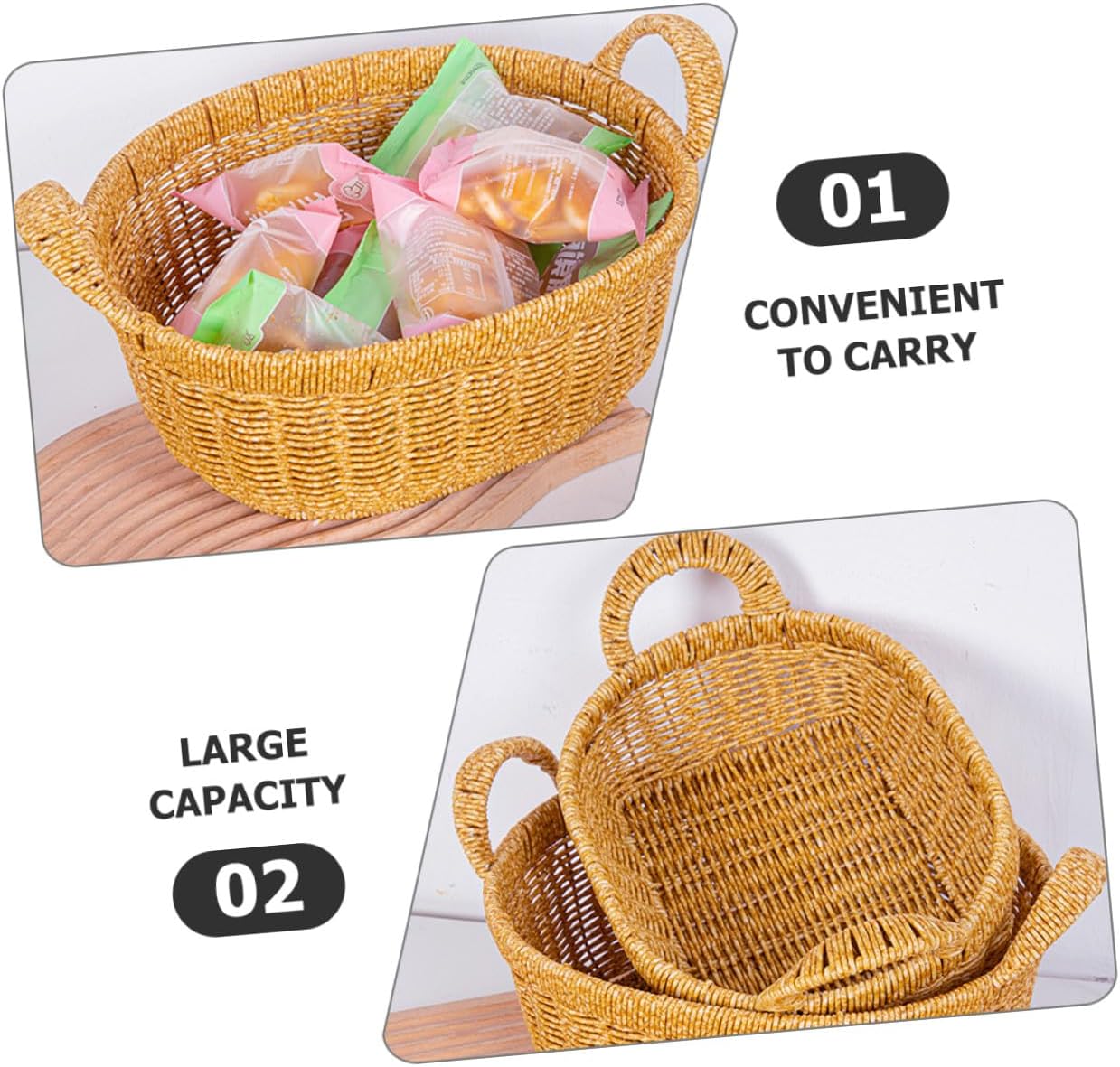Package List 1 x basket Features -Material:PP bread basket for serving -Product Info:Fruit plate bread basket -Color:Khaki woven storage basket -Size:35.00X30.00X18.00cm/13.76X11.79X7.07in imitation rattan dessert rack - The weaving basket can be very suitable for picnic, home storage tray, home decoration simulated rattan serving tray. - The excellent workmanship of our product will bring you a satisfying using experience and bring you happier mood fruit basket. - Easily match your interior decor and bring some retro and rustic beauty to any interior space imitation rattan woven baskets. - Multi-purpose, not only suitable for home life but also for outdoor picnics and travel household food holder. - Can be placed in your living room, dinning room, kitchen, and other area as an ornament for your home pantry baskets.Goods Informationoutdoor tray Easy to install and use, it can be easily applied to your home, a very practical accessory that will meet your needs well.display basket This product is a woven basket, which is made of PP material, with good texture, safe and practical