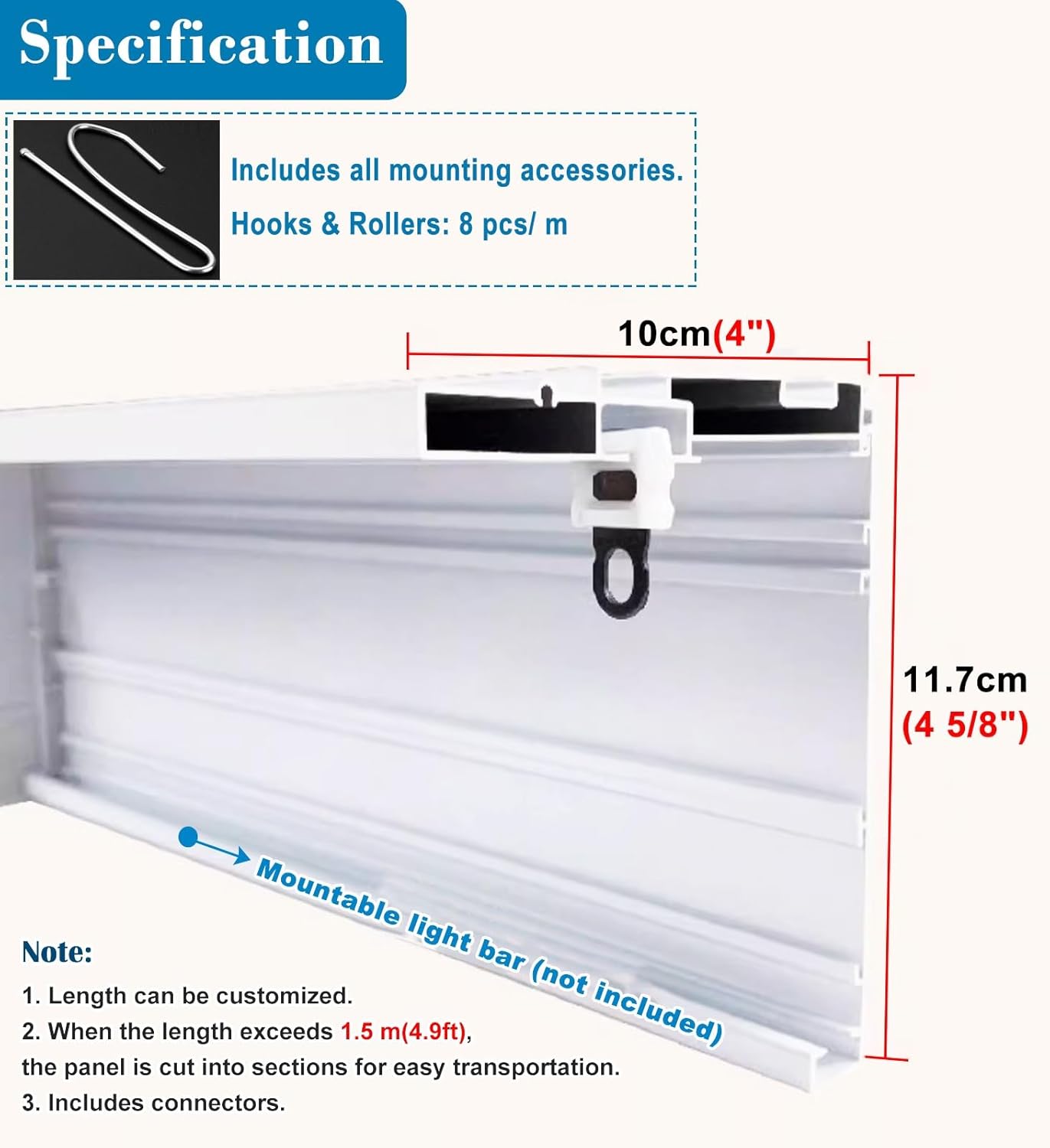 Transform your living space with our versatile 3-in-1 curtain track system, designed to enhance any room's aesthetic while providing functional benefits. Ideal for living rooms, bedrooms, or even commercial spaces, this curtain track offers a seamless solution to manage your drapery needs. **Package Includes:** - 1 x Curtain Track and Pelmet - All Mounting Accessories **Specifications:** - Material: Durable Aluminium Alloy - Track Type: Single Track - Hooks & Rollers: 8 pcs/m - Load Capacity: 60 kg (132 lbs) - Length Options: 1-5 m (3.3 - 16.4 ft) - Customizable and Cuttable for a perfect fit **Key Features:** - Crafted for longevity, this sturdy curtain track ensures reliable performance over time. - Experience silent sliding that maintains a peaceful environment for your family. - Compatible with thick curtains and drapes, allowing you to achieve the desired style and functionality. - Effortlessly glide your curtains along the track for easy operation. - A versatile design that caters to various window sizes and room layouts. - Keeps curtains securely in place, enhancing privacy and controlling natural light. - Suitable for various applications, including ceiling-mounted tracks and hospital curtain systems. **Installation Guide:** - For lengths exceeding 1.5 meters, sectioned installation is required. Connectors are included in the package. - Please note that slight color variations may occur due to monitor differences and lighting conditions. **Customer Support:** - We are committed to your satisfaction. Should you have any questions about our product, our dedicated customer service team is available 24/7 to assist you. Elevate your decor while enjoying the practical benefits of our curtain track system. Perfect for creating a stylish yet functional space.
