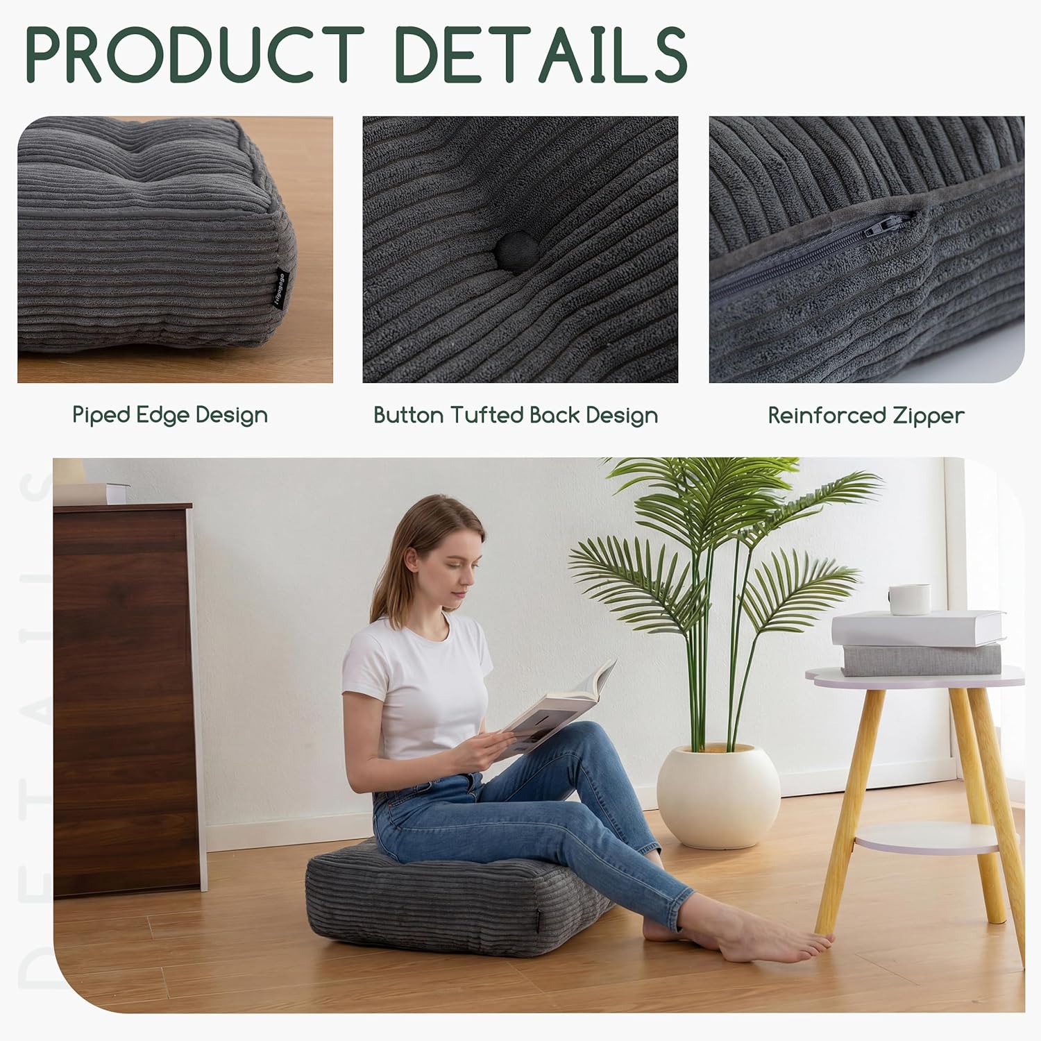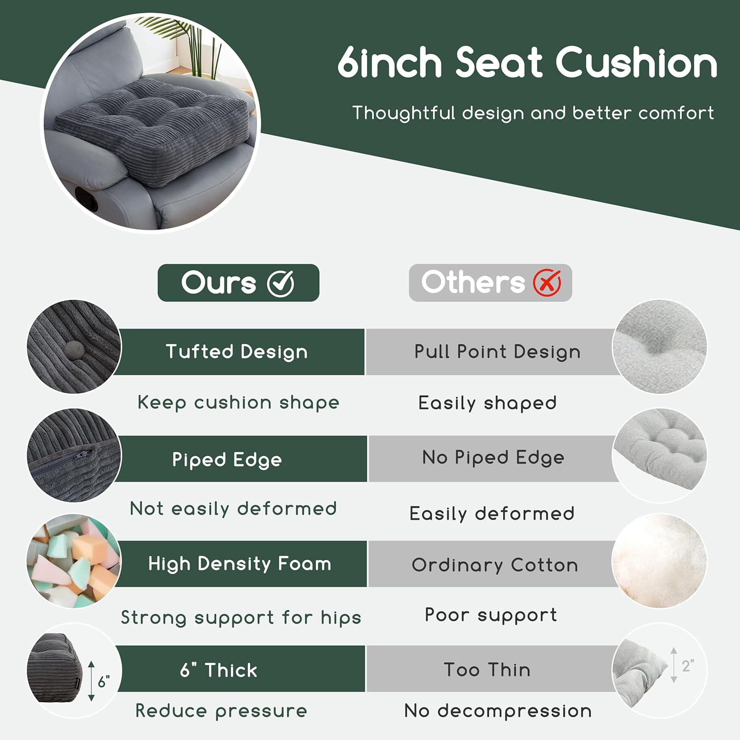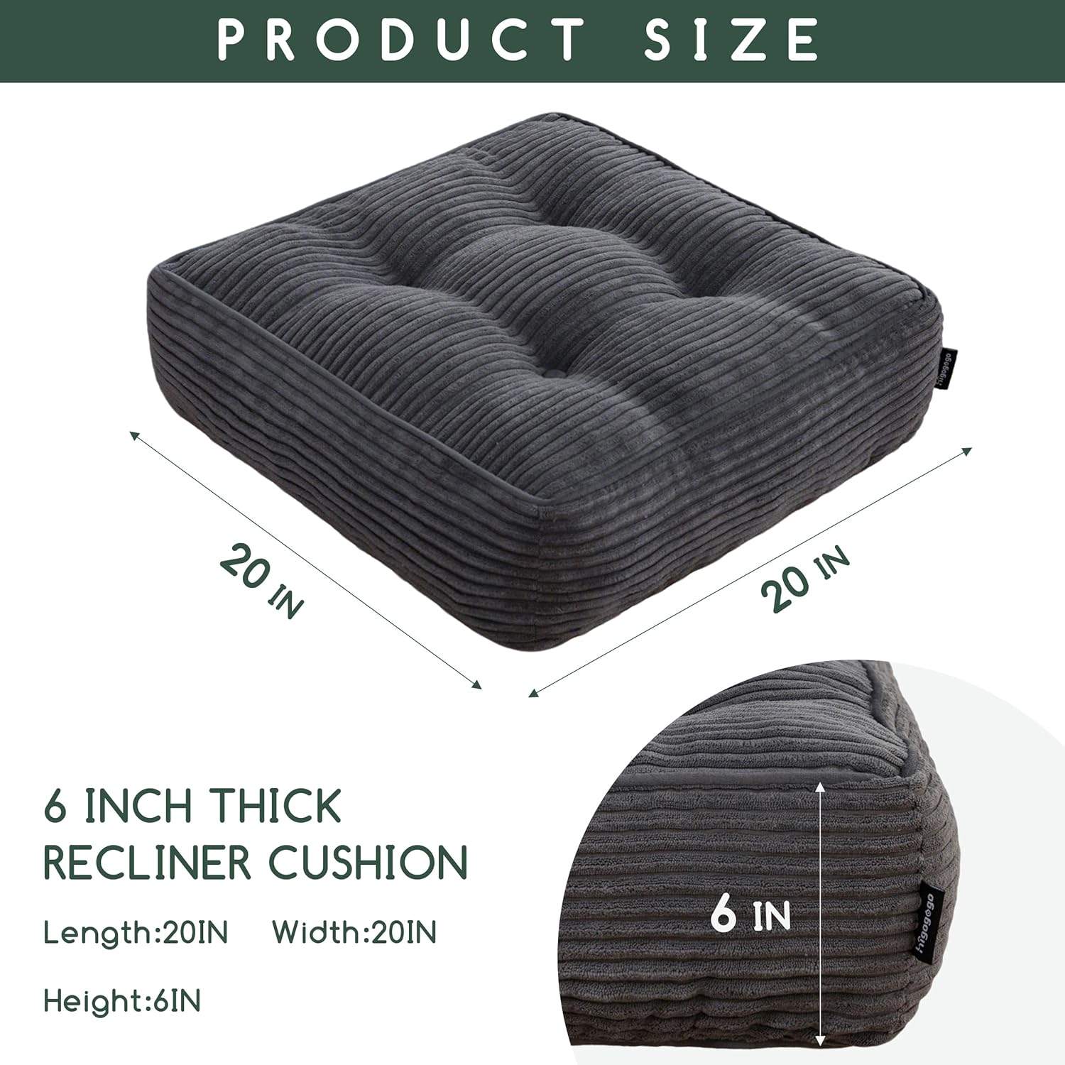 Tufted Corduroy Recliner Seat Cushion for Elderly, 20x20x6 Inch Extra Large Square Seat Cushion for Recliner Chair, Floor Pillow, Office Chair, Car, No Pressure on Thighs, Dark Grey