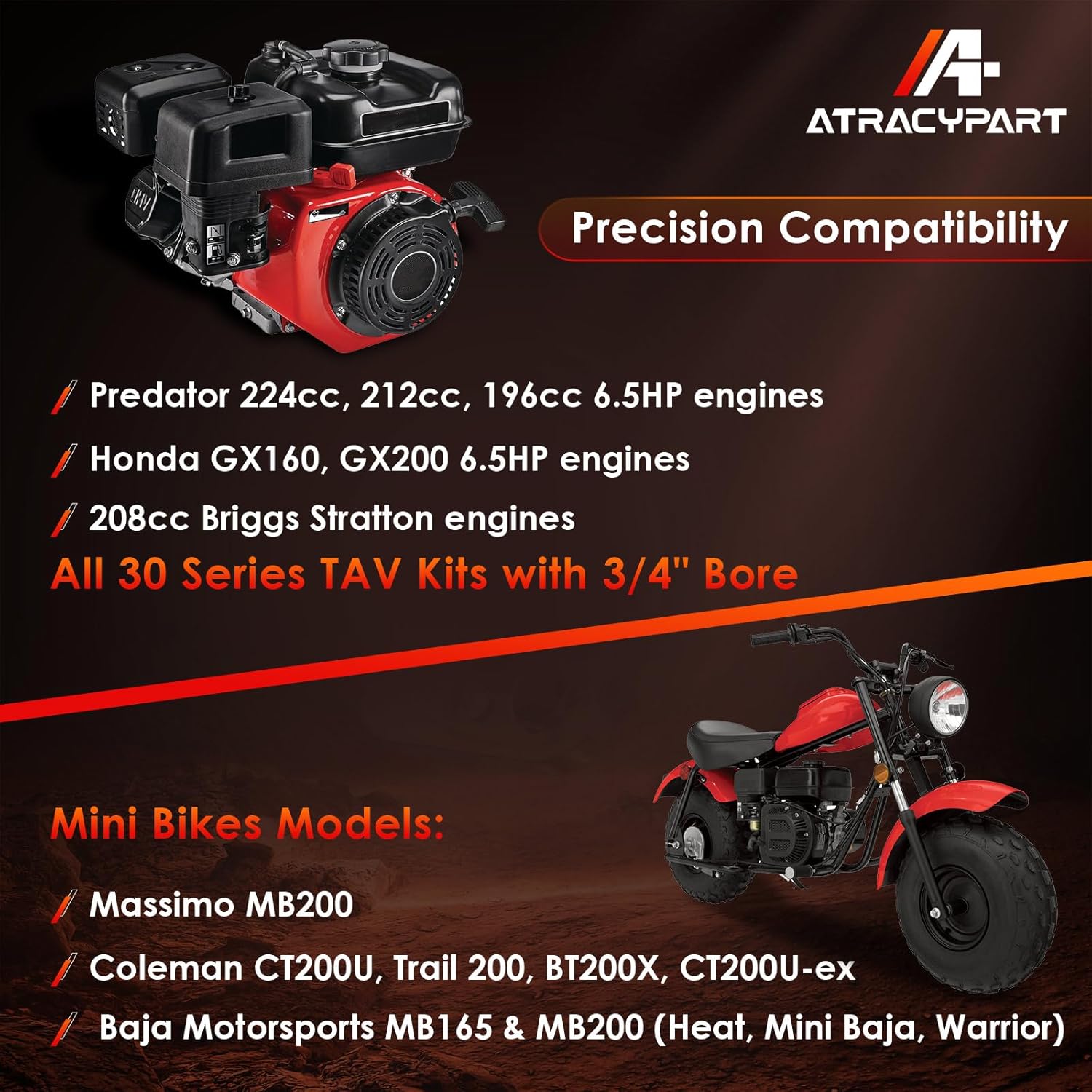 Engine Compatibility:Fits Predator 224cc, 212cc, 196cc 6.5HP enginesHonda GX160, GX200 6.5HP engines208cc Briggs Stratton enginesAll 30 Series TAV kits with 3/4" shaft enginesMini Bikes Models: Coleman CT200U, Trail 200, BT200X, CT200U-exMassimo MB200Baja Motorsports MB165 & MB200 (Heat, Mini Baja, Warrior)Specification:Bore: 3/4" (0.750")Keyway: 3/16" (NOT INCLUDED)Wide asymmetrical belt Engagement: 2,500 RPMTested up to 8,500 RPM for high performancePackage Include:1 x 30 Series Torque Converter Driver Clutch1 x 203589/5959 Drive Belt2 x 3/4" GasketsWarranty:12-MonthAt ATRACYPART, we take pride in the quality of our products and in your satisfaction. If you have any problems, do not hesitate to contact us.