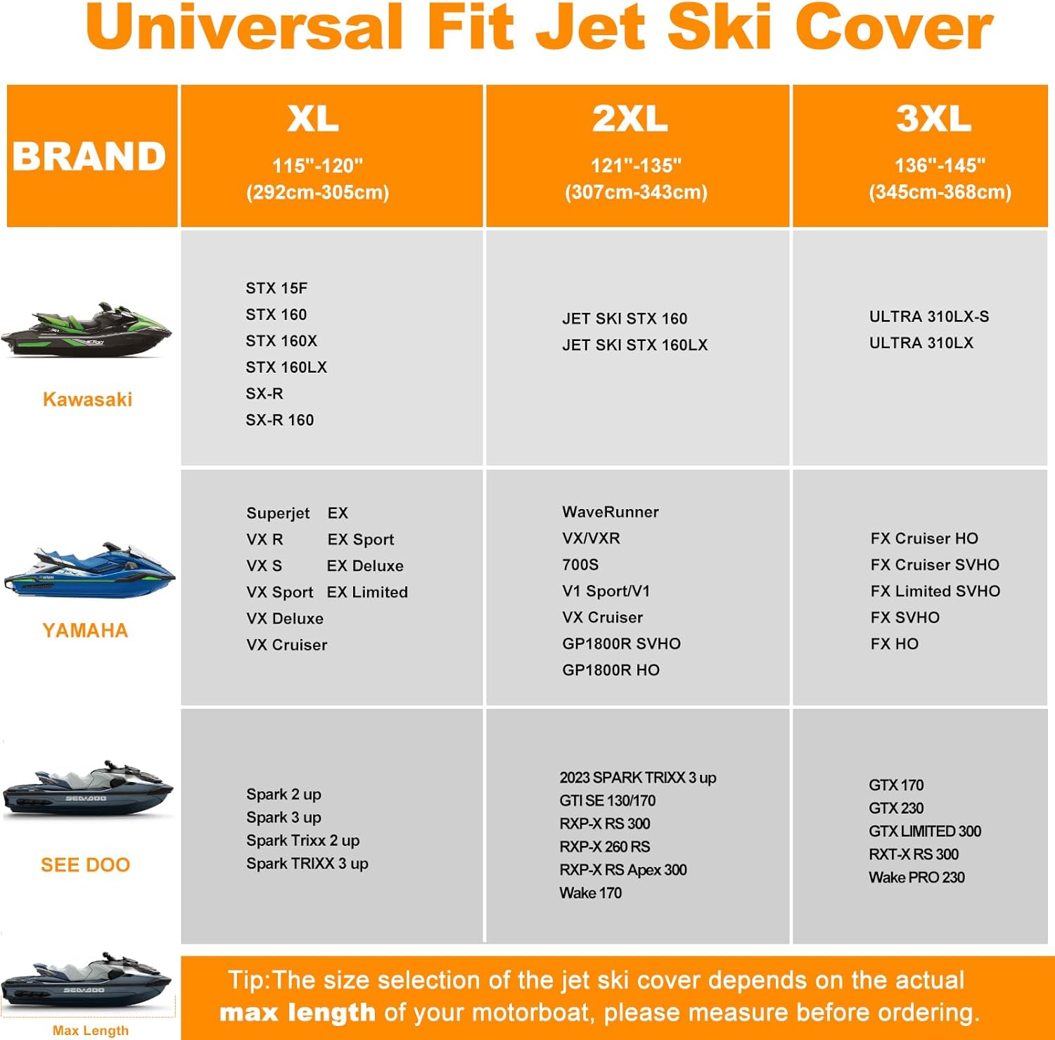 | Coverage | Full exterior coverage for Personal Watercraft (universal fit) |