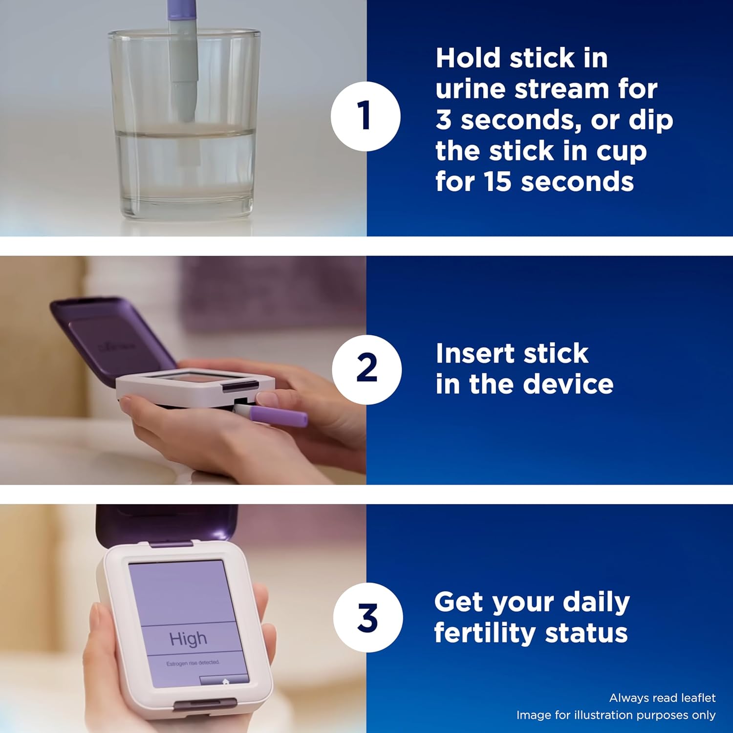 Product Description "Trying for a baby? It can feel like a guessing game at times, so knowing your most fertile days each cycle is a must. With the Clearblue Fertility Monitor with Touch Screen (Monitor de fertilidad Clearblue con pantalla tactil), you can identify which days you’re most likely to get pregnant. Clearblue Fertility Monitor Test Sticks are designed for use with Clearblue Fertility Monitor with Touch Screen (Monitor de fertilidad Clearblue con pantalla tactil), which is designed to detect all your fertile days[1]. Each home fertility test refill pack includes 30 individually wrapped test sticks. Most women will need 10 tests each cycle, while women with irregular or long cycles may have to use 20 tests each cycle. They must be used with the Clearblue Fertility Monitor (sold separately). The monitor works by tracking both estrogen and luteinizing hormone (LH) to typically identify up to 6 fertile days. It tells you when to test your urine and displays your daily fertility status as Low, High, or Peak. Its easy-to-use touch screen also lets you record your period dates and when you have sex and can compare up to 6 cycles in either a monthly calendar or graph for side-by-side comparison[3]. [1] Number of fertile days will vary. In a German study of 149 cycles, Monitor results correlated with serum hormone levels & ultrasound-observed ovulation. [2] Clearblue Ovulation assay showed 97% agreement with ultrasound-observed ovulation. Behre HM., et al. Human Reproduction (2000) 15: 2478-82. [3] Completed cycle data if available." From the Manufacturer To use the Clearblue® Fertility Monitor – the #1 brand recommended by OB/GYNs – to maximize your chances of getting pregnant, you will need to purchase the Clearblue Fertility Monitor Test Sticks separate from the device. Clearblue Fertility Monitor Test Stick packs include 30 individually wrapped test sticks. The majority of women will need 10 test sticks each cycle. Women with irregular or long cycles may have to use 20 test sticks each cycle.About the Clearblue Fertility MonitorTaking conception to the next level, the Clearblue Fertility Monitor maximizes a woman’s chances of conceiving a baby by identifying 3x more fertile days compared to traditional ovulation tests. This electronic, hand-held monitor tracks a woman’s personal cycle, detecting two key ovulation hormones: luteinizing hormone (LH) and estrogen. Using the two hormones, the device can pinpoint not only a woman’s 2 peak fertility days, but also 1-5 additional high fertility days prior to ovulation – for a total of up to 6 fertile days.Benefits of Using the Clearblue Fertility MonitorIt has been shown to accurately predict ovulation when compared to serum hormone measurements and vaginal ultrasound scans2, but testing can be done at home and at a fraction of the cost.It gives a more accurate indication of more fertile days than any other home method.It’s quick, easy to use, and easy to understand. The Monitor indicates when to test and the level of fertility every day, requiring no subjective interpretation.It personalizes to a woman’s cycle, storing her information for up to six previous menstrual cycles.It’s natural – no drugs or invasive devices and procedures.It gives advance notice of Peak Fertility, so couples can plan intercourse at their convenience.How the Fertility Monitor WorksThere are only a few days per cycle when a woman is fertile and can conceive. The following chart outlines the phases of a woman’s menstrual cycle, showing how the two most fertile days coincide with the LH surge (24-36 hours before ovulation) and the release of an egg (ovulation). These are a woman’s 2 best days to conceive a baby.However, it is generally acknowledged that sperm can survive up to 5 days in the sperm-supportive mucus found in a woman’s body during the fertile days of her cycle meaning there is a fertile window of typically up to 6 days: 5 days before ovulation plus the day of ovulation. Traditional ovulation tests like Clearblue Digital Ovulation Test track the LH hormone and identify a 2 day window of fertility. But the Fertility Monitor also tracks estrogen levels, which rise just before the LH surge, extending the fertile window typically up to 6 days. This extended window can help to reduce the time it takes to conceive2 as it gives more days to try, plus gives advance notice of the 2 peak days.Testing DirectionsThe Fertility Monitor is easy to use and gives you clear accurate results.On the first day of your period, you will press the M button to let the monitor know a new cycle has begun.Each day, you must switch on the Monitor and follow its directions.On mornings when the Monitor requires further information about your hormone changes, a test will be requested.Simply remove the test stick from its wrapper. (The majority of women need 10 test sticks each cycle. Women with irregular or long cycles may have to use 20 test sticks each cycle.) Point the Sampling End of the test stick downstream in your urine for 3 seconds.Take the cap off the handle and place it over the Sampling End of the test stick and remove any excess urine.Holding the test stick by the cap, insert the test into the Monitor’s Test Stick Slot, pressing down until it clicks into place.The display will flash for approximately 5 minutes while reading your information.After 5 minutes, the Remove Test Stick symbol will flash. Once you have removed the test stick, your fertile status will be displayed.Low fertility = very small chance of conceiving High fertility = increased chance of conceiving Peak fertility = highest chance of conceivingTesting for PregnancyWhen you’re ready to test for pregnancy, choose a brand and product you can trust. In the Clearblue Pregnancy Test Buying Guide, we outline the different features of pregnancy tests so you can feel maximum confidence throughout the entire conception process.More about Predicting OvulationAs the diagram above illu