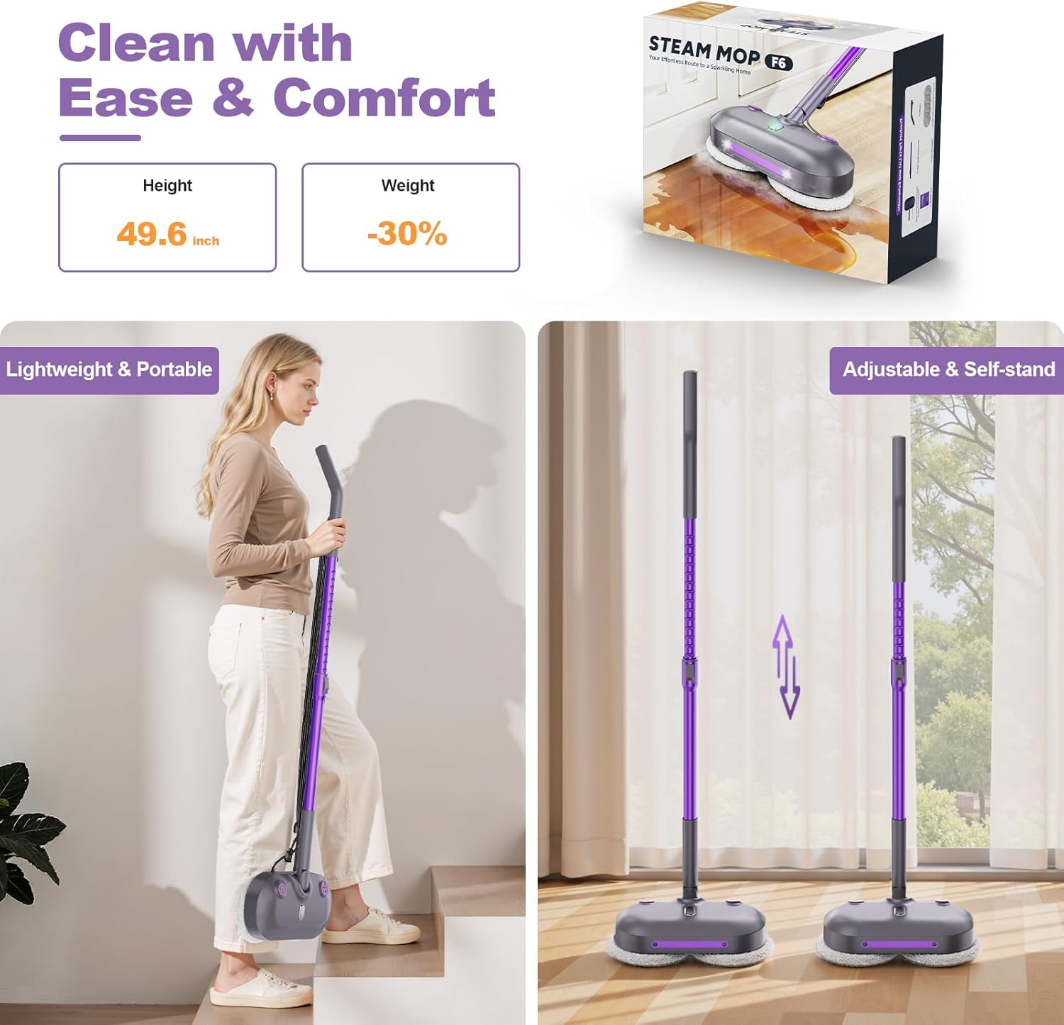 | Special Features | 【Child & Pet Safe】, 【Rotating Mop Pads】, 【284°F High-Temperature Steam】, 【Large Capacity Tank】, 【Long Power Cord】, 【Washable & Reusable Pads】, 【Adjustable Height】, 【Lightweight】, 【Portable】, 【Quick Heat Up】, 【Self-Standing】 |