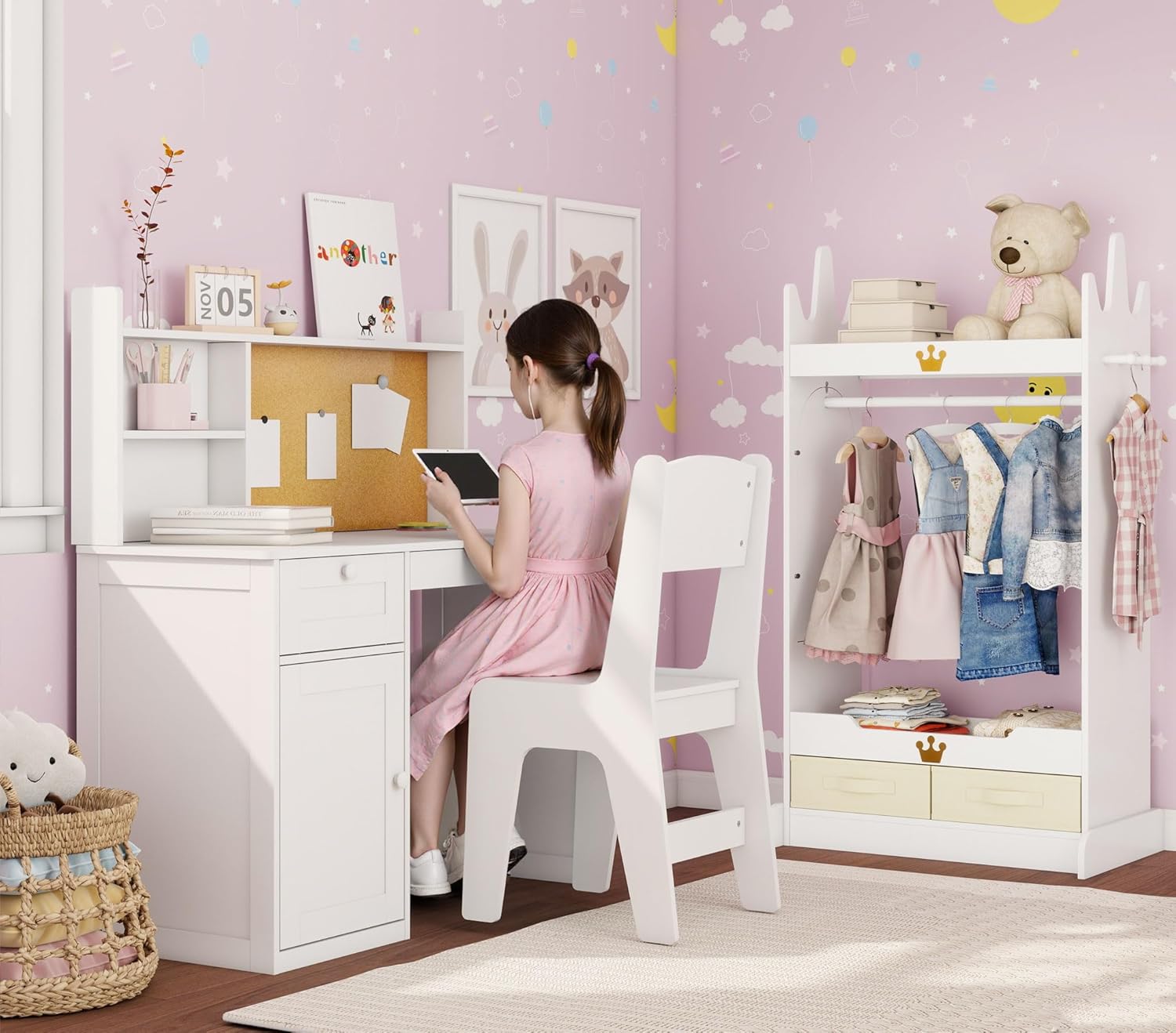 Want to spruce up your kid’s space with gear that works hard and feels fun? This kids desk and chair set and dress up rack bundle is just what you need. It fits neatly in bedrooms or nurseries without cluttering the room, perfect for homework, crafts, or dress-up play. The study desk and chair are made of eco-friendly engineered wood, certified by ASTM, CPSIA, and CPC for safety. They feature a hutch for books and crafts, a drawer for supplies, and a cabinet for bigger items plus a cork board for notes or their favorite art. The tilted chair supports good posture while rounded corners and anti-tip hardware give you peace of mind. The charming crown-detailed dresser for kids keeps clothes and costumes organized. It has a hanging rod, a top compartment for toys and accessories, open shelves for folded items, fabric bins for socks or small toys, and a stable reinforced base. The built-in mirror turns getting dressed into a fun part of playtime. Best of all, this white furniture helps kids build tidy habits early so you won’t find scattered supplies around. Both pieces come with labeled parts and clear instructions so you can assemble them in hours no fancy tools required. Our 24 hour customer support is here to help quickly if you need it. This bundle isn’t just furniture it’s a cozy hardworking space where your kid can learn, create, and play to their heart’s content, growing with them for years to come.