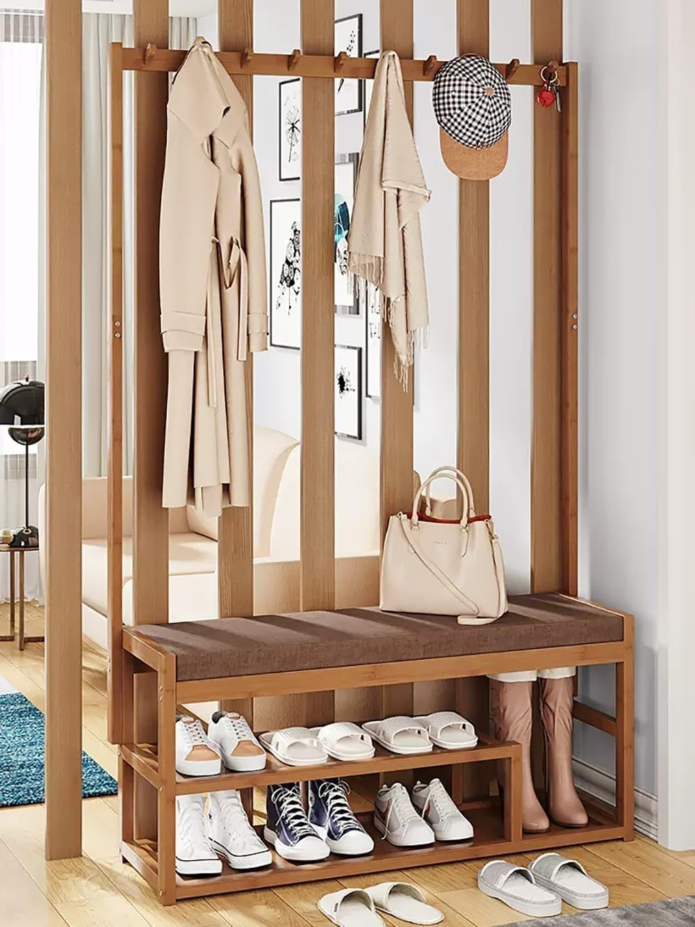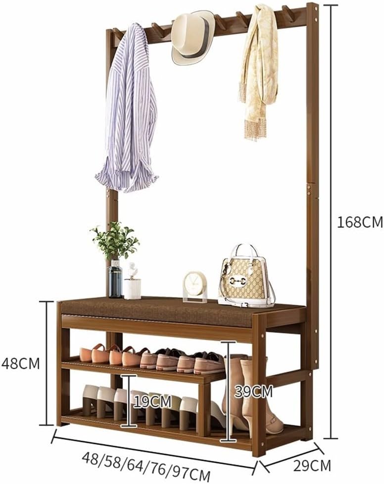1.Our clothes rack contains many different storage spaces such as shoe rack, small storage space with lid, 5 hook etc. 2.The multifunctional storage space can accommodate clothes, hats, shoes, scarves, etc. 3.The elegant and retro clothes rack can be used at the front door, bedroom and wardrobe etc. are placed. It is both practical and beautiful. 4.Enjoy a comfortable seating area Product details: Material: bamboo, foam padding Size: 50/60/70/80/100 x 29 x 168 cm (L x W x H) Weight: 6-8 kg Max. load capacity of the bank: 100 kg Max. load capacity per tray: 20 kg Max. load capacity per hook: 3 kg Scope of : 1 x wardrobe; 1 x seat cushions; 1 x accessory bags; 1 x Instructions