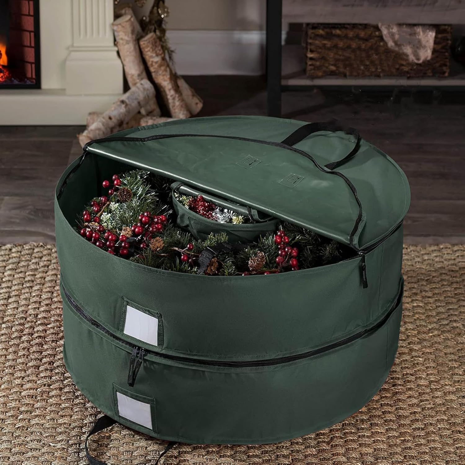 Description: This Wreath Storage Bag is a practical solution tailored to keep your Christmas wreaths in perfect shape throughout the year. Made with quality 600D waterproof fabric, it effectively shield your wreaths from dust, , and environmental damage, ensuring they remain fresh and vibrant for seasons to come. The innovative double-layer construction combined with reinforced stitching and a double zipper closure adds an extra layer of protection, preventing crushing or distortion while stored. Measuring 30 inches in diameter, this versatile bag fits most standard wreath sizes comfortably, while its round shape preserves the wreath's form without bending or squeezing. The sturdy carry handle enhances portability, allowing convenient transport from storage shelves to your door or festive display locations. Its green exterior is not only festive but also practical, seamlessly integrating into holiday décor or storage spaces. Easy-access double zippers enable quick setup or packing, making holiday preparations effortless. This Christmas Wreath Storage Container is an indispensable storage solution for keeping your wreath safe, clean, and ready for every holiday season. Features:. -Color: Green. -Material: 600D. -Size: about 76.2*40cm/30*16 in. Note:Manual measurement, please allow slight errors on size.The colors may exist slight difference due to different screens. Package Including 1 x Wreath Storage Container
