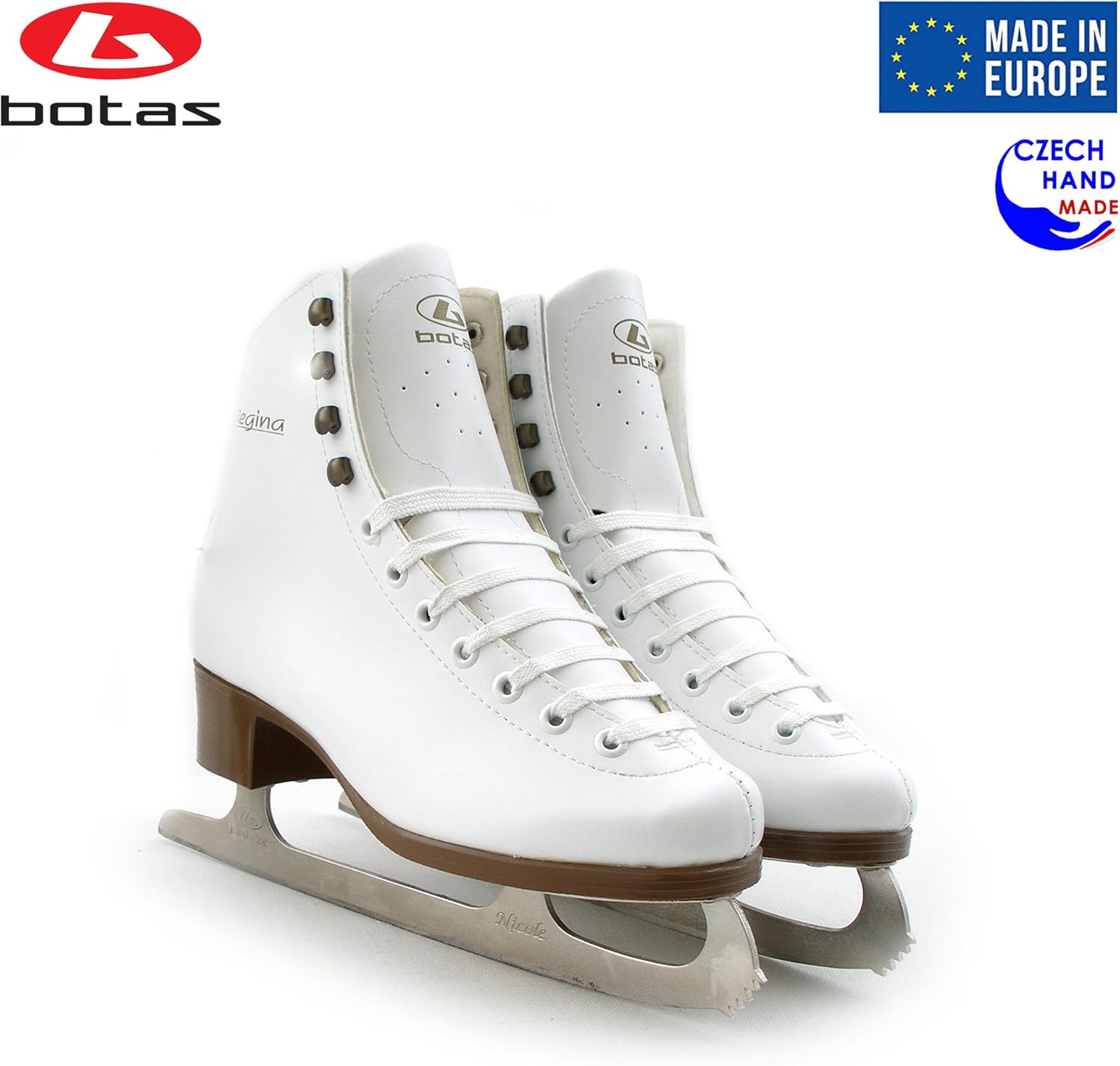 BOTAS - model: REGINA / Made in Europe (Czech Republic) / Comfortable Figure Ice Skates for Women, Girls, Kids / NICOLE blades / WHITE colorComfortable ladies footwear with quality synthetic materials with waterproofing, reinforced upper, wider shape and ankle padding for greater comfort; synthetic lining, BOTAS Nicole skates with TUV GS European certificate.The European design provides solid ice skates women will enjoy. The REGINA ice skates/figure skates combine technologies to create a comfortable and sturdy product. This innovative model provides solid ice skates for women, available in child or adult sizes. REGINA can be used as figure skates for women or ice skates for toddlers. The boot combines figure skates leather for a firm fit and comfortable lining making REGINA an excellent set of figure skates for girls or figure skates kids will love. The ankle padding, tongue, and a flexible collar around the calves makes these ice skate girls will want to use. Comfort is key. REGINA is the best choice of ice skates children can enjoy and figure skates youth can use safely. The soft lining's comfortable feel provides figure skates girls, kids or women will perform well with, and safety enthusiasts will approve the enhanced support for figure skates a child can use easily. These are figure skates women can perform well in and ice skates girls of any age will find comfortable.