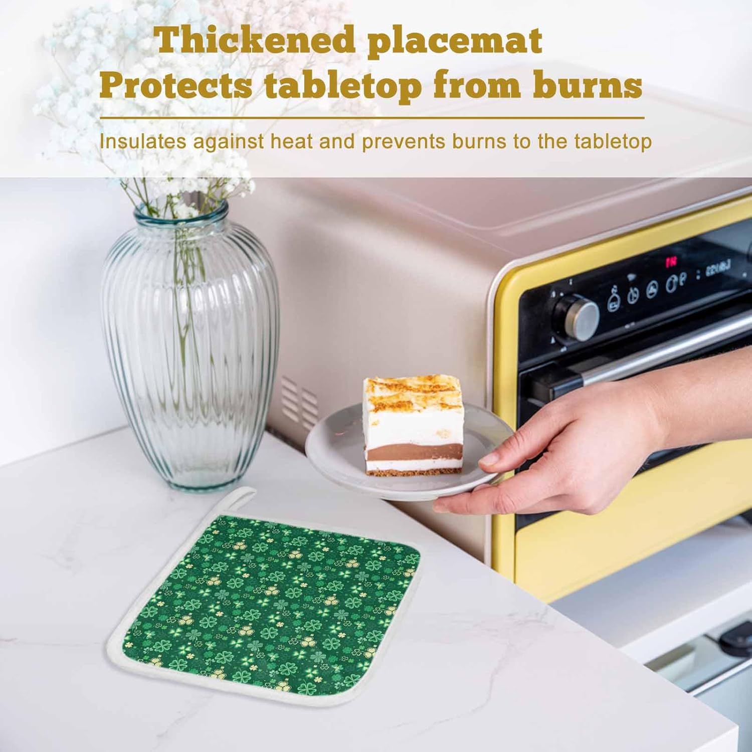 Pot Holder InformationPotholder Material: Heat insulation polyester fabric.Hot Pad Size: 8.25x8.25in (21x21 cm) x2/3/4/5pcsExcellent Pot Holders for KitchenLong Service Life: With the premium and exquisite craft, the trivets for hot dishes are durable and not easy to come off.Heat Proof Mat: With our oven pad, you ensure easy maneuvering of items right out of the oven, microwave, grill, or stove. No more dropping dishes on the floor because you got uncomfortably hot.Protector Pad: With ultimate heat proof, oven potholders are perfect for handling hot dishes, pots and pans, which can effectively protect your tabletop from scalding.Thermal Insulation Handle: Our pan handle holders are a perfect accessory for all metal cooking pans, especially cast iron pots and pans that can get extremely hot. This kitchen accessory creates a safe and comfortable grip so you can cook with ease.Hanging Loop: With the unique lanyard design, you can hang the pot rack on a door handle, oven, hook, or anywhere you can easily reach it for easy access and takes up little space.Wide ApplicationAll Occasion Suitable: Hot pot holders are suitable for daily use in home kitchen and dining room, and also perfect for gatherings, restaurants, hotels, parties, weddings, banquets, buffets, catering.All-purpose: The hot pot mat can not only be used as camping pot holder, baking oven hot pad, cooking potholder, roasting pan holders. Our trivets can be placed under cups, mugs, vases and ashtrays for decoration.Great Gift: Hot pads for countertops with stylish pattern are charming gift for Halloween, Thanksgiving, Christmas, New Year, birthdays, housewarming, anniversaries, etc.Warm TipsEasy Clean: The heat insulation mat can be machine washed. The pot holder for tabletop is not easy to shrink after washing and can be reused.