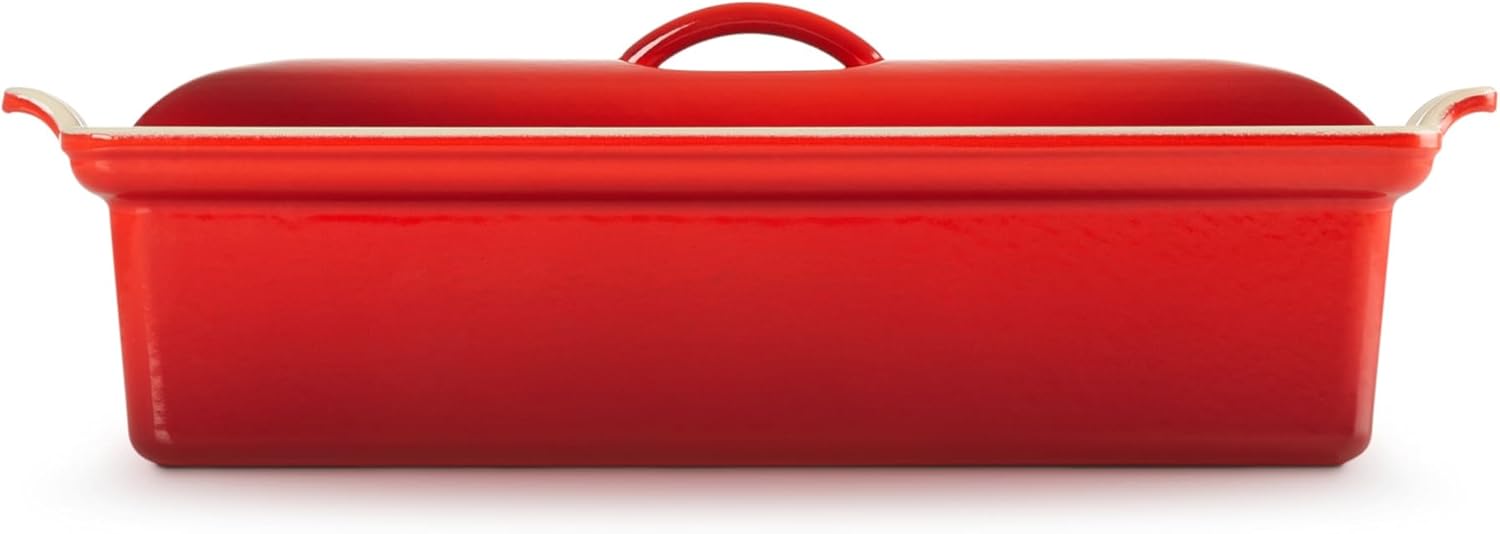 Product Description Terrine dishes are traditionally used to compact a forcemeat mixture like pate (the resulting form is also referred to as a terrine). Some terrines include a weighted press that molds the mixture from all sides. As the meat cools, the fat within it begins to set, helping the terrine hold its form Amazon.com Because pâtés require gentle, even heat, an enameled cast-iron pan like this one is essential for properly cooking them with or without a water bath. They can also be chilled in the pan before unmolding, or they can be served directly from the pan. Classically shaped, the pan measures 12-1/2 inches long, and its interior is 3-1/8 inches wide and 2-1/4 inches deep. That shape and size also suits many other dishes, such as pretty breads, meatloaf, cakes, and deep-dish savory pies. (Recipes included.) For pâtés, the pan's heavy, tight- fitting lid has a tiny vent for steam to escape. Because the terrine's enamel coating is impervious to acids and odors, it can be used for marinating. It's also dishwasher-safe. Like all Le Creuset cast-iron cookware, this pan is hand cast in a one-of-a-kind sand mold and hand finished at the Le Creuset factory in France. It carries a lifetime warranty against defects. --Fred Brack