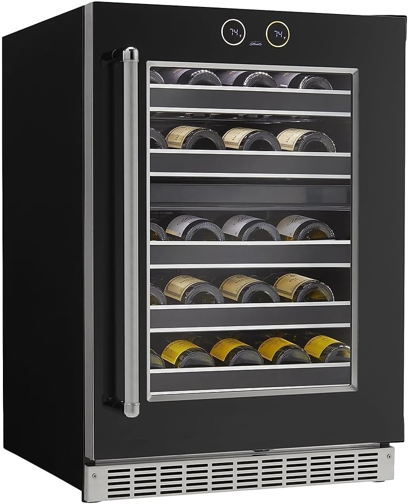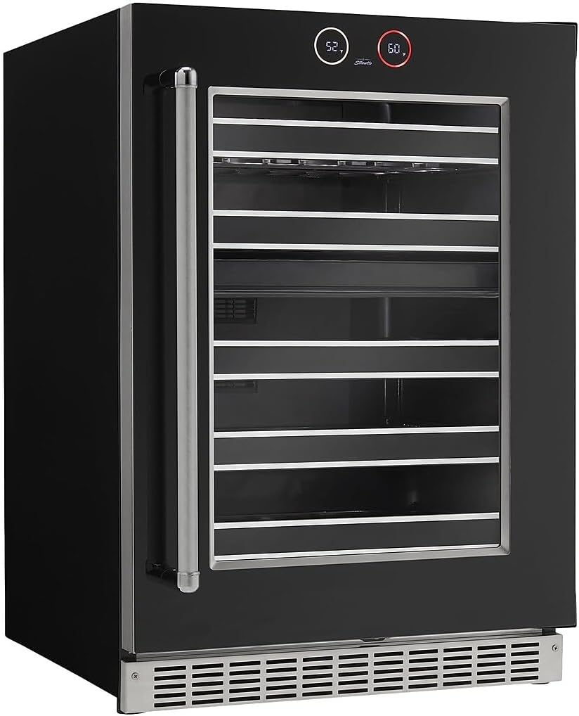 Features: This product's large 5.0 cu. Ft. capacity provides ample room for all your wine storing needs This wine cooler will hold up to 37 regular size wine bottles with ease Easy to use electronic controls with digital display gives you precise temperature control If the door is left open for more than five minutes an alarm will sound keeping you informed This right handed door is not reversible. Left handed model is SRVWC050L Fully finished black cabinet allows for free standing installation but can also be fully built in Incandescent lighting illuminates the interior of this beverage center so you can find what you need Convenient automatic defrost ensures a long lasting product and reduced maintenance schedule The temperature in this wine cooler ranges from 41 F to 64 F Two year parts and labor manufacturer gives you peace of mind Specifications: Bottle Capacity: 37 Total Capacity: 5.0 Cu. Ft. Bulb Type: Incandescent Shelf Material: Wood Depth: 24" Height: 34-13/16" Width: 23-7/8" Voltage: 115 V