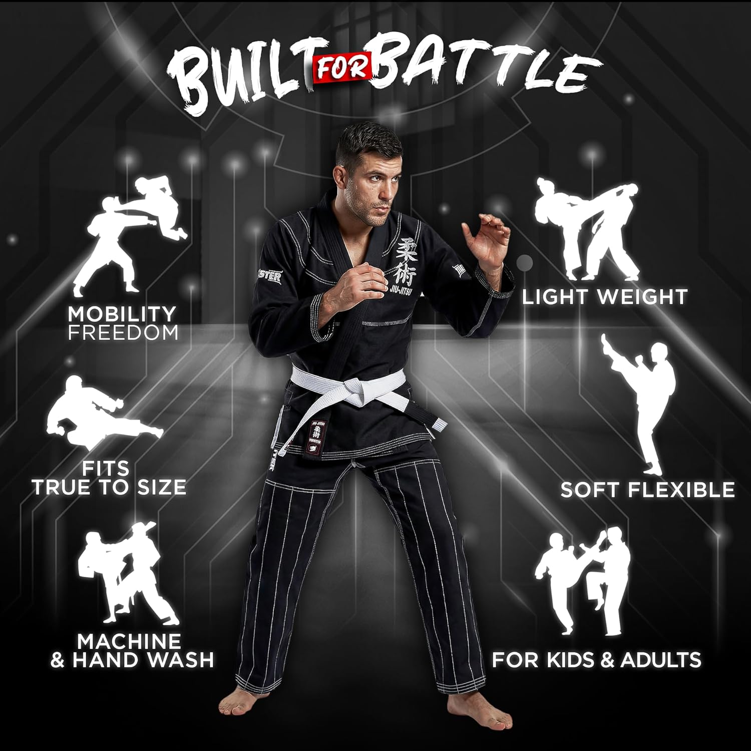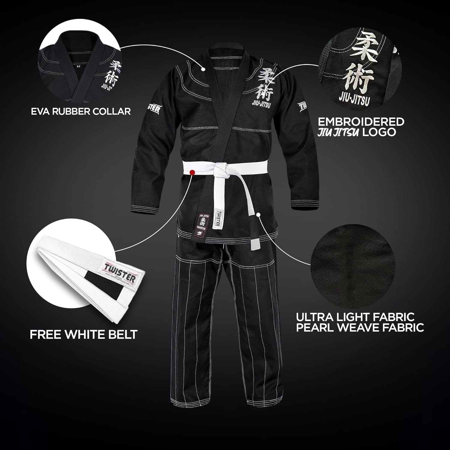 Twister Fight Wear Jiu Jitsu Gi Premium Pearl Weave BJJ Kimono With Free Belt & Bag Experience unmatched comfort, durability, and performance with the Twister Fight Wear Jiu Jitsu Gi, engineered for training, rolling, and competition. Designed with the perfect balance of softness and strength, this gi delivers reliable performance for beginners, intermediate students, and advanced practitioners alike. FREE White Belt With Stripe Bar Each gi includes a premium white belt crafted from the same durable material as the uniform itself. The belt features a built-in stripe bar, allowing new athletes to earn and display their stripes proudly as they progress through their BJJ journey. Pre-Shrunk Fabric for a Consistent Fit Made from pre-shrunk fabric, this gi maintains its size and shape after washing. For best results, wash your gi in cold water and hang it to dry—no worrying about unwanted shrinking or fit changes. Lightweight, Strong & Competition-Ready Constructed using high-quality Pearl Weave material, this BJJ gi offers the ideal blend of lightweight comfort and long-lasting strength. Reinforced stitching and embroidery patches on the lapel, chest, shoulders, back, and legs enhance durability and provide a professional, athletic look.